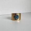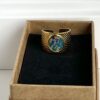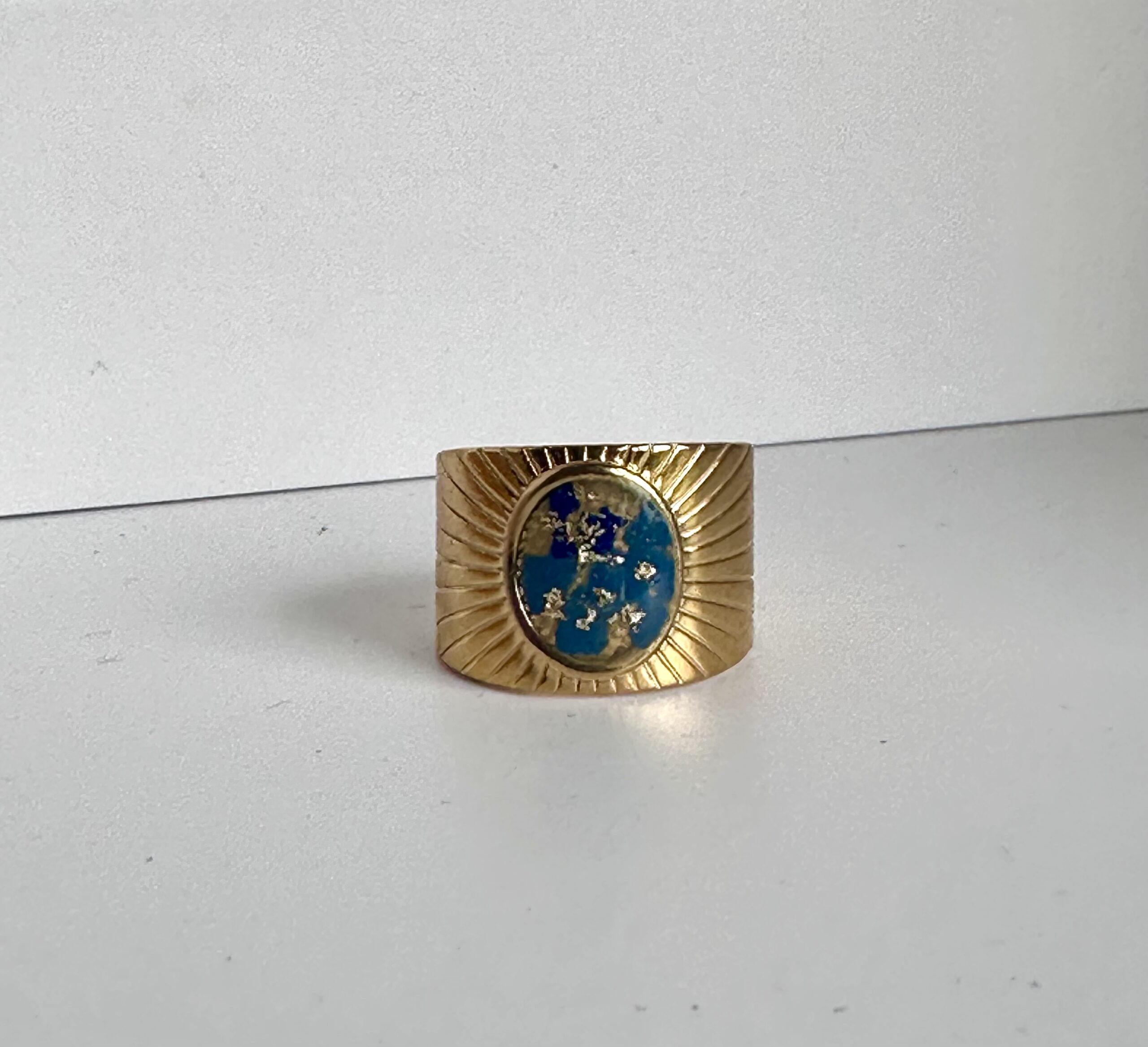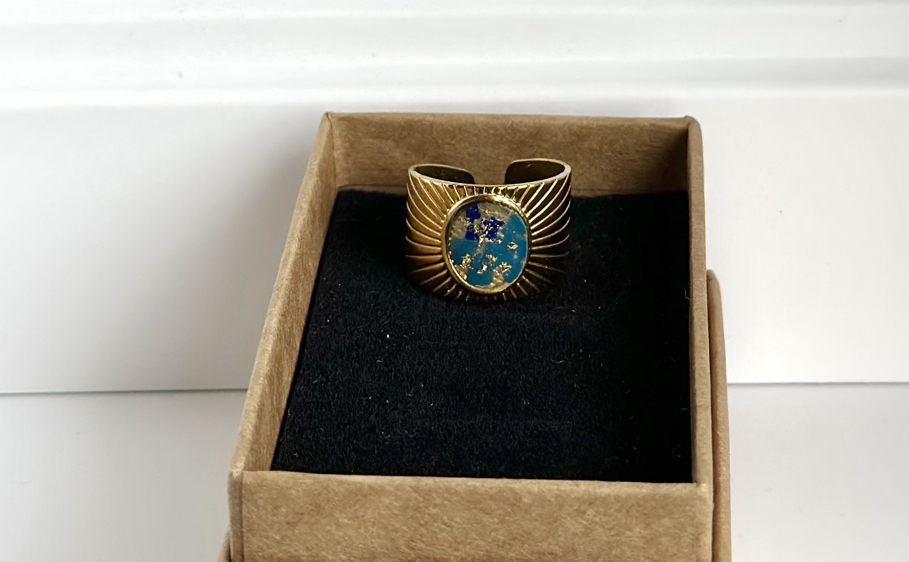 Bague en acier inoxydable doré agrémentée d’un papier Népalais floral bleu et recouvert de résine.