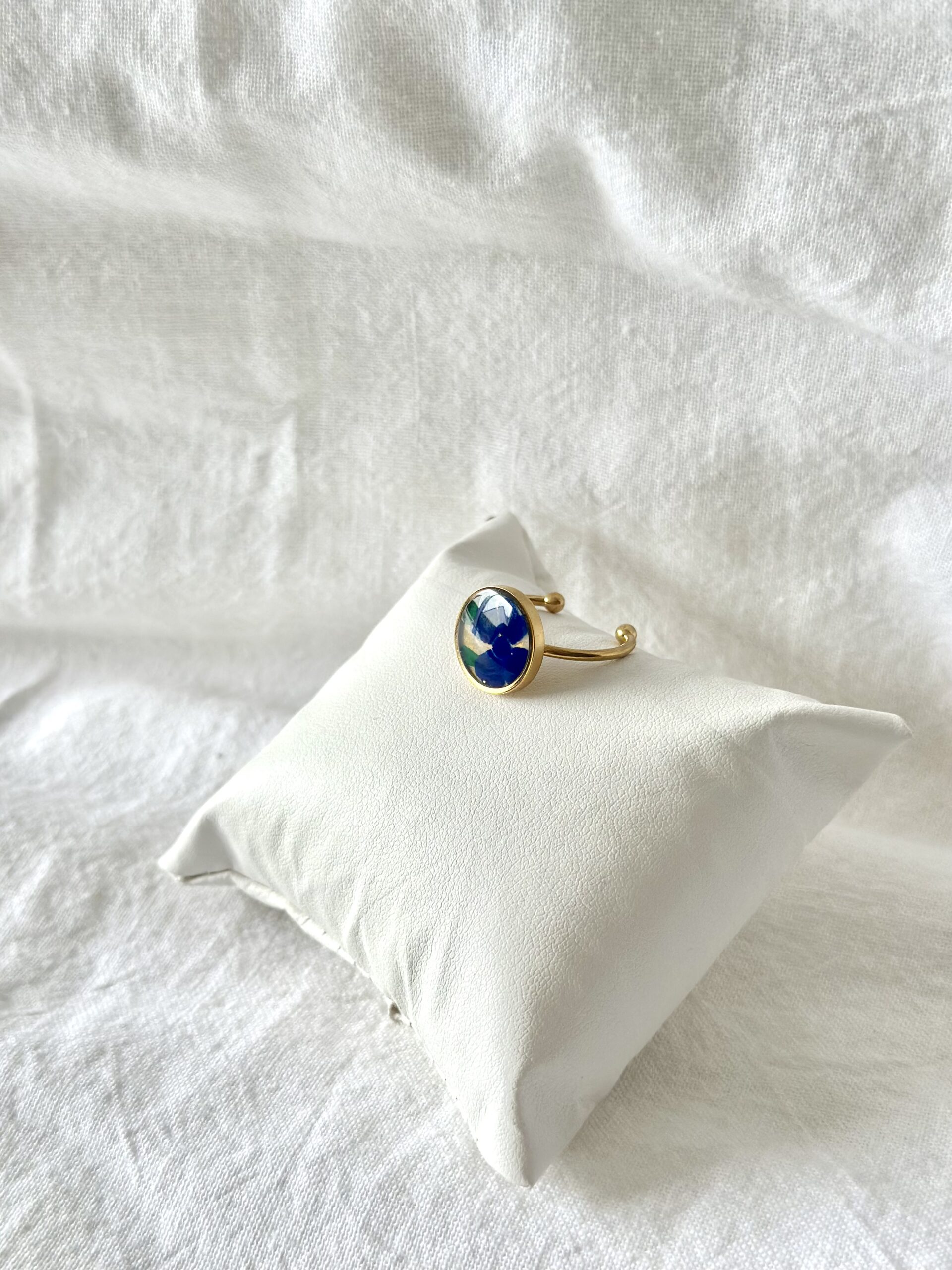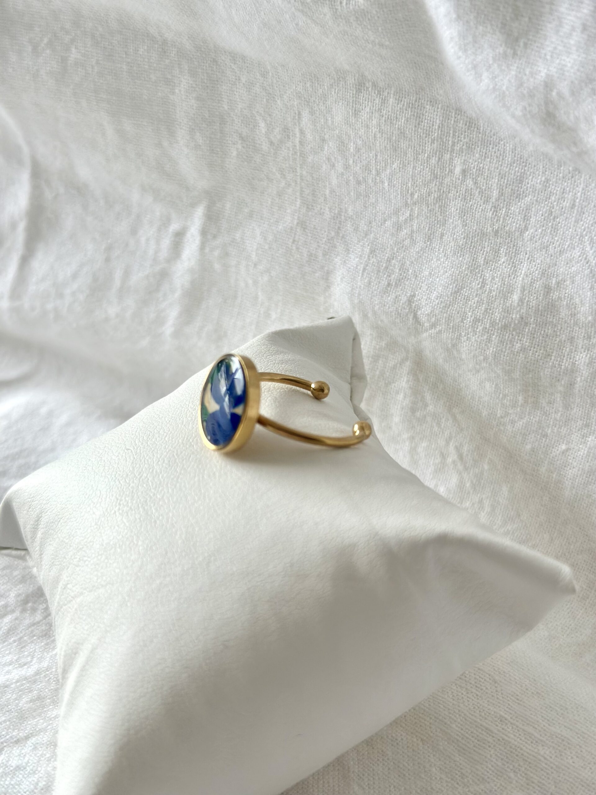 Bague ajustable en acier inoxydable agrémentée d’un papier népalais bleu et vert qui évoque la nature. Ce papier fabriqué à la main riche en textures et en nuances est protégé d’une couche de résine qui révèle son coloris éclatant. La monture fine apporte une touche élégante et discrète.