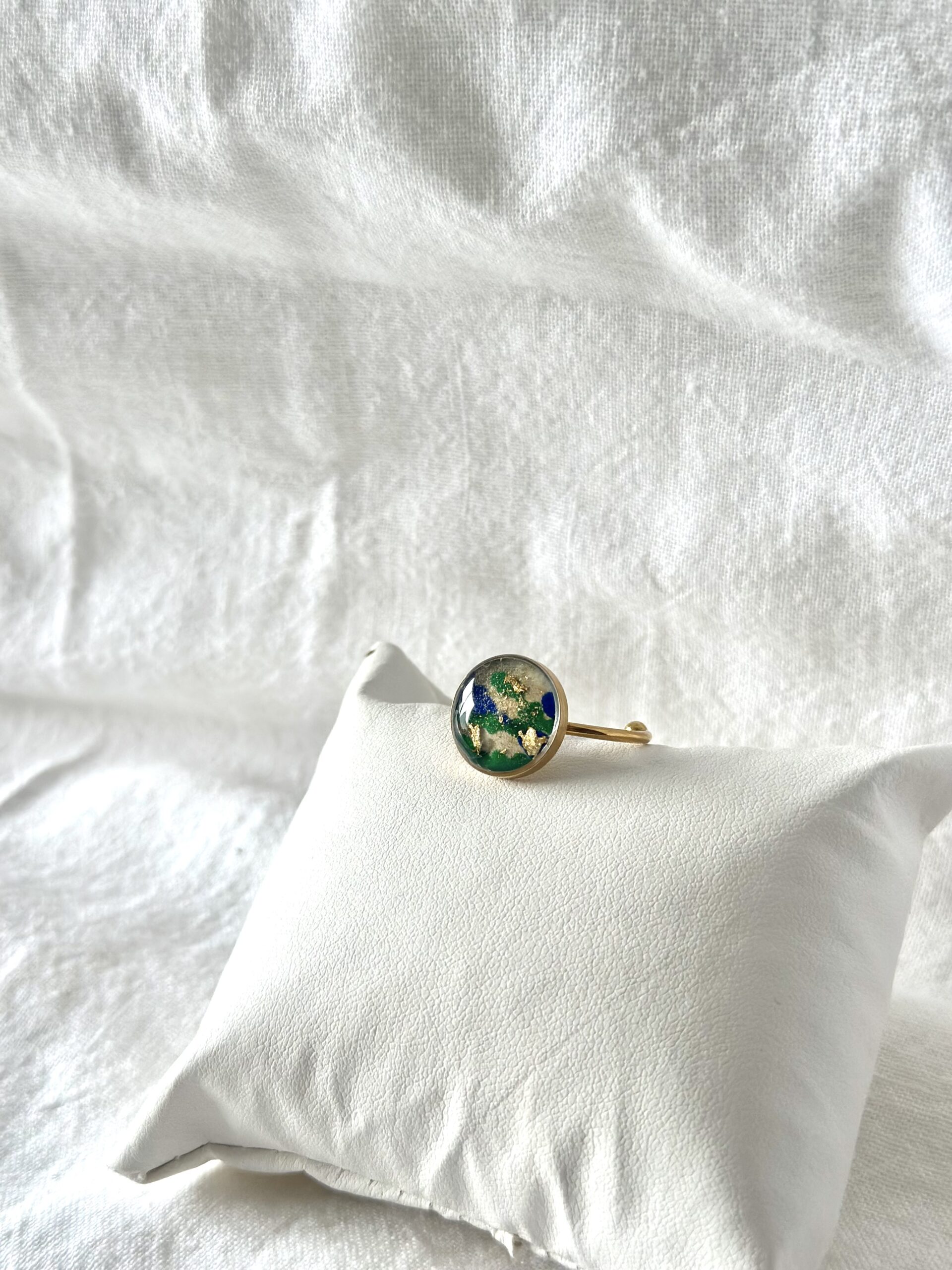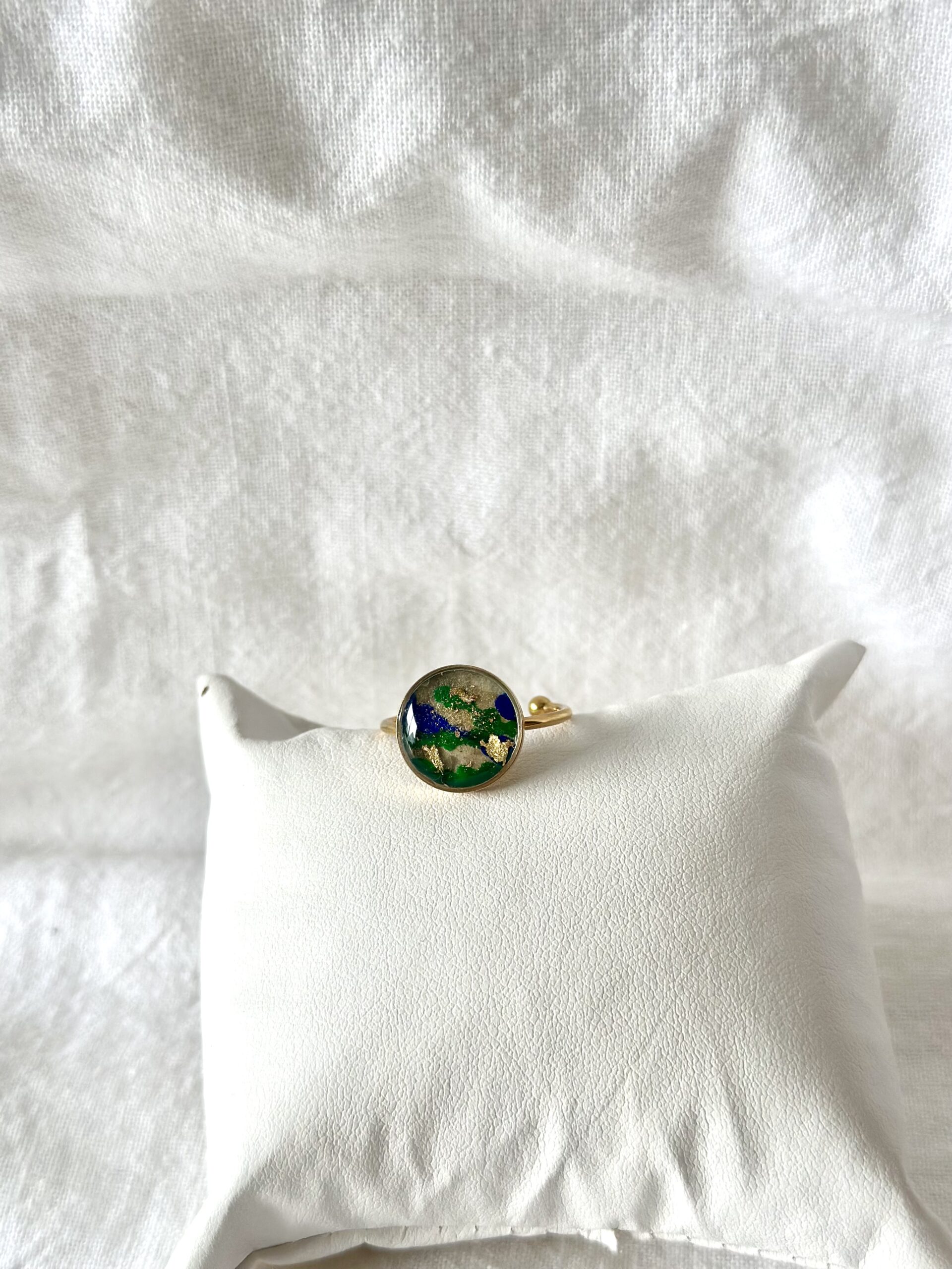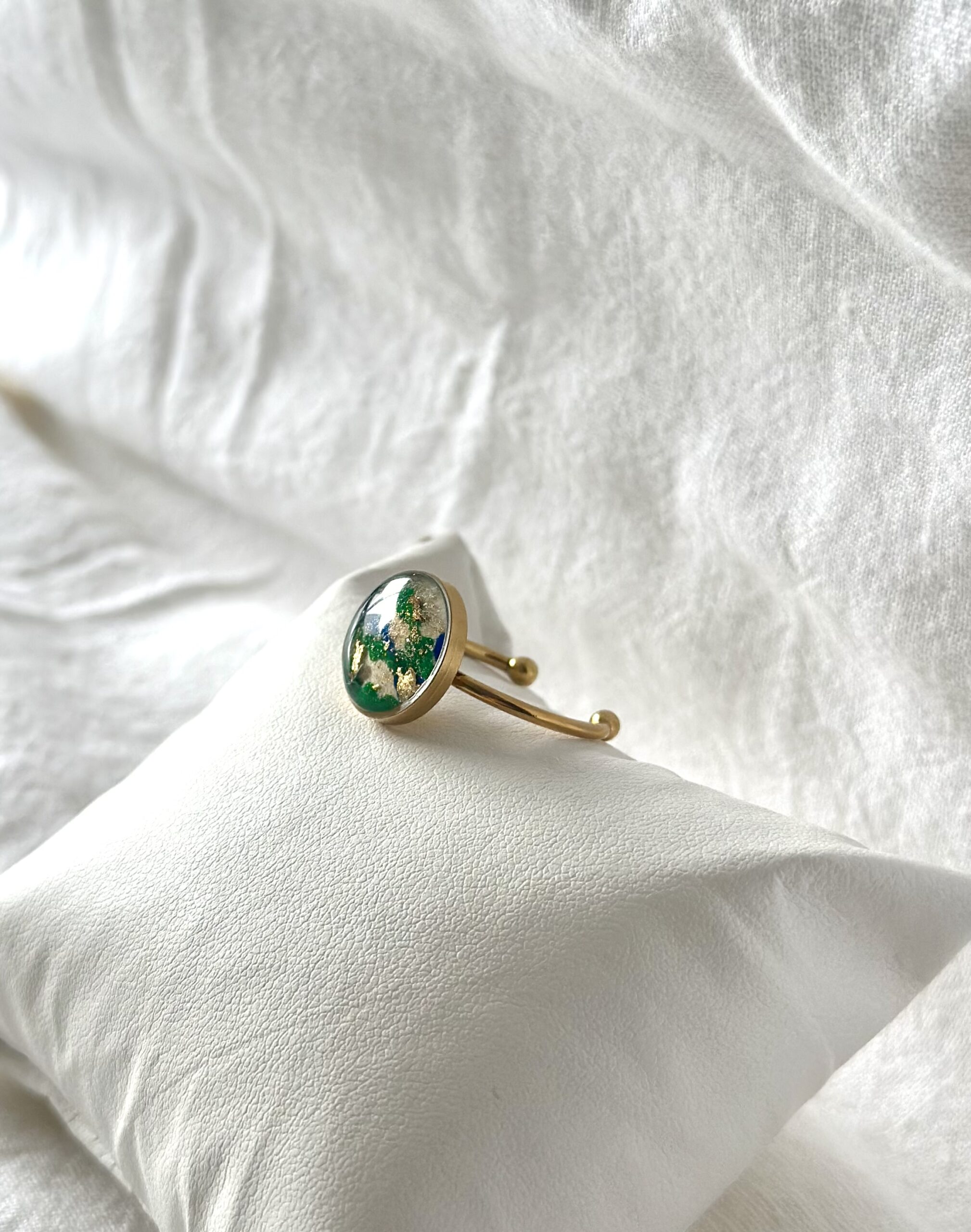 Bague ajustable en acier inoxydable agrémentée d’un papier népalais bleu et vert et or qui évoque la nature (cercle environ 14 cm). Ce papier fabriqué à la main riche en textures et en nuances est protégé d’une couche de résine qui révèle son coloris éclatant. La monture fine apporte une touche élégante et discrète.