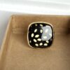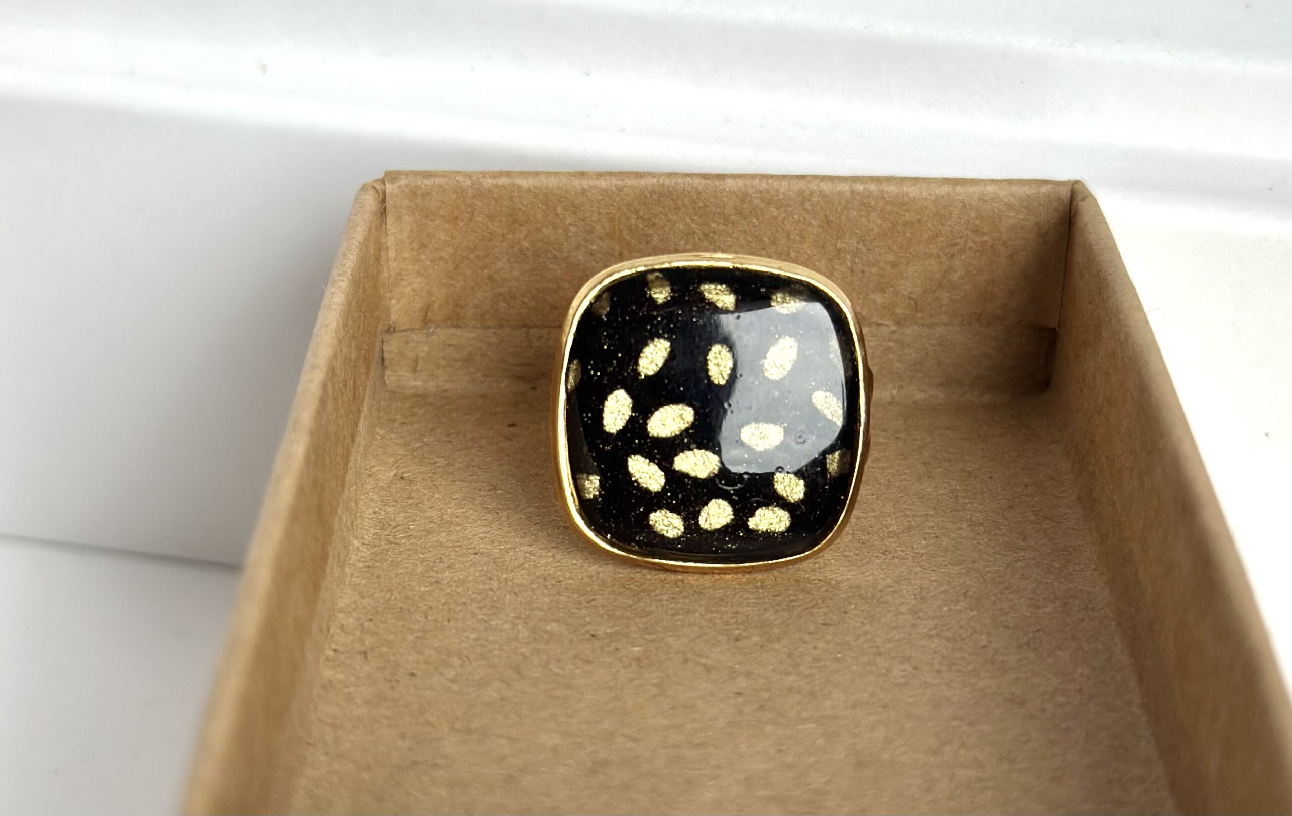 Bague élégante au design carré, en acier inoxydable doré. La bague est ajustable à votre doigt. Son décor en papier Népalais noir et doré est résiné pour une meilleure protection. Son design est original et contemporain.