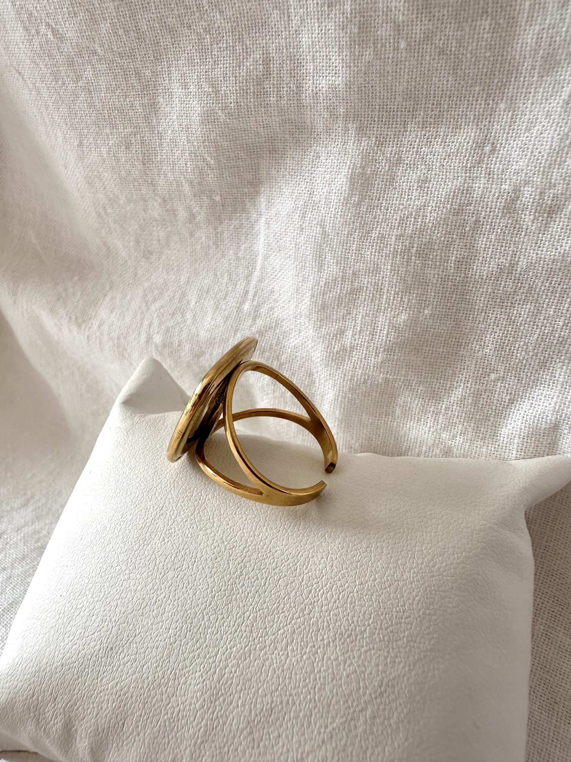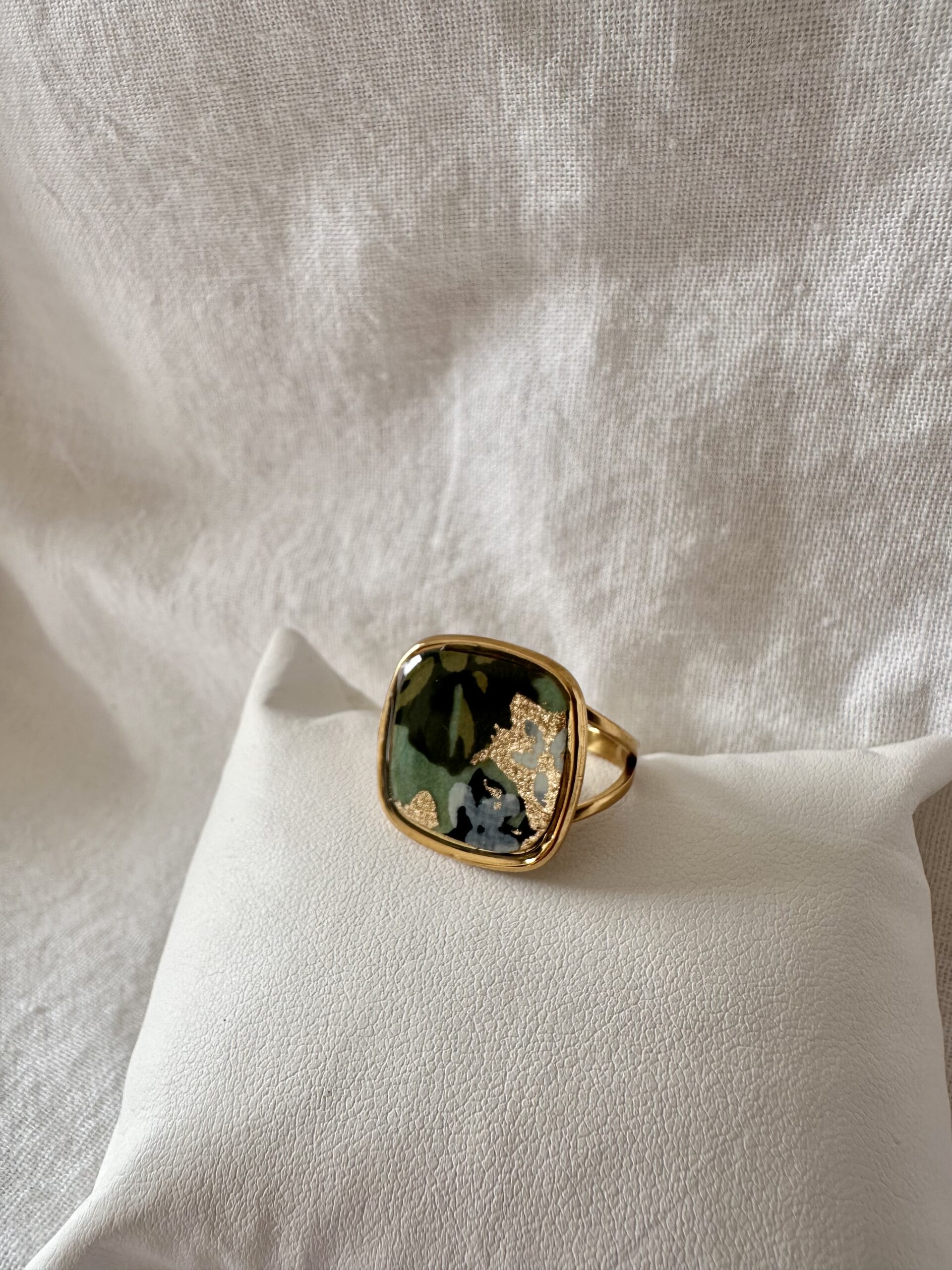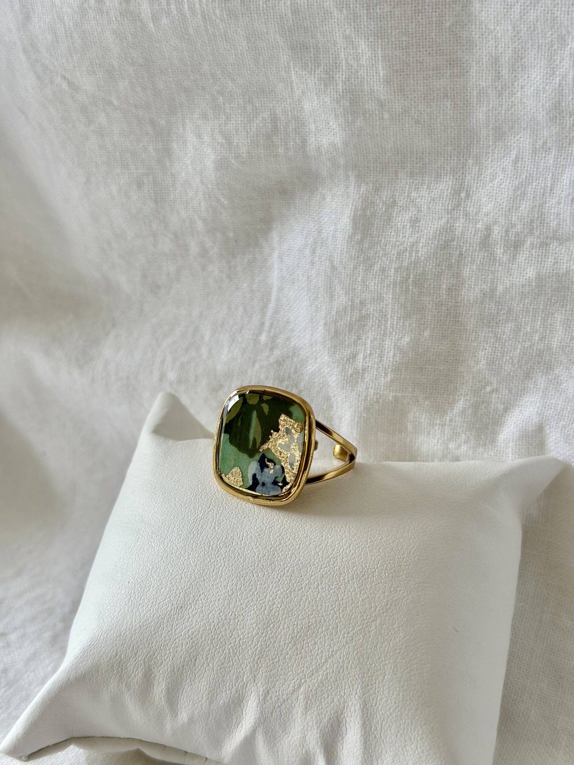 Bague élégante au design carré, en acier inoxydable doré. La bague est ajustable à votre doigt. Son décor en papier de coton vert et doré est résiné pour une meilleure protection. Son design est original et contemporain, sa couleur moderne attire le regard.