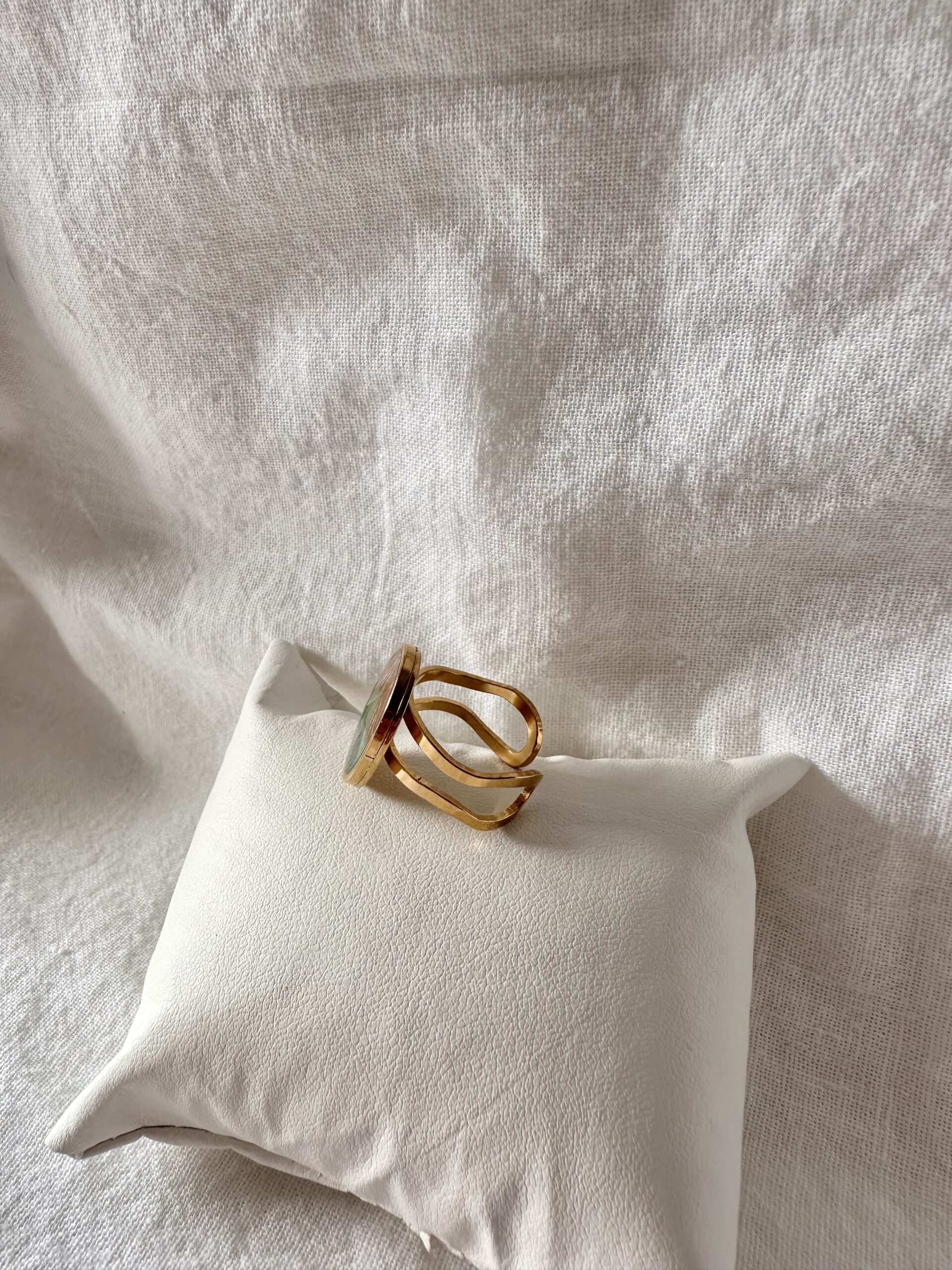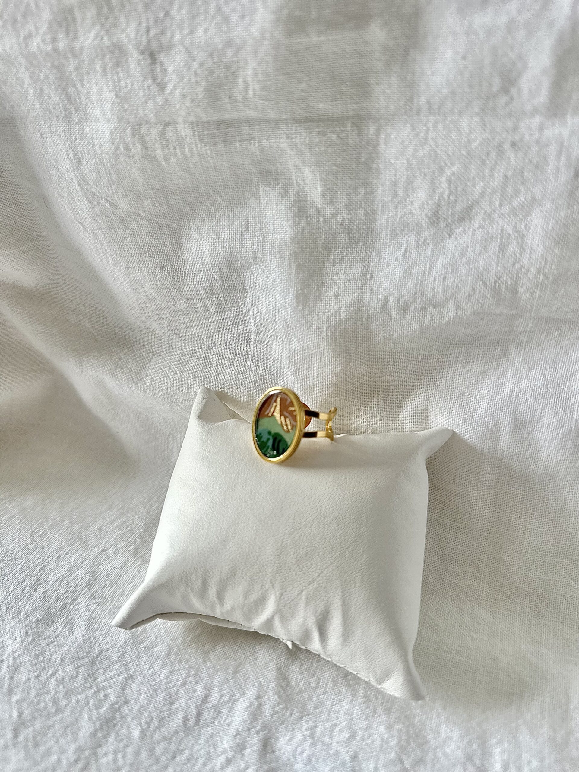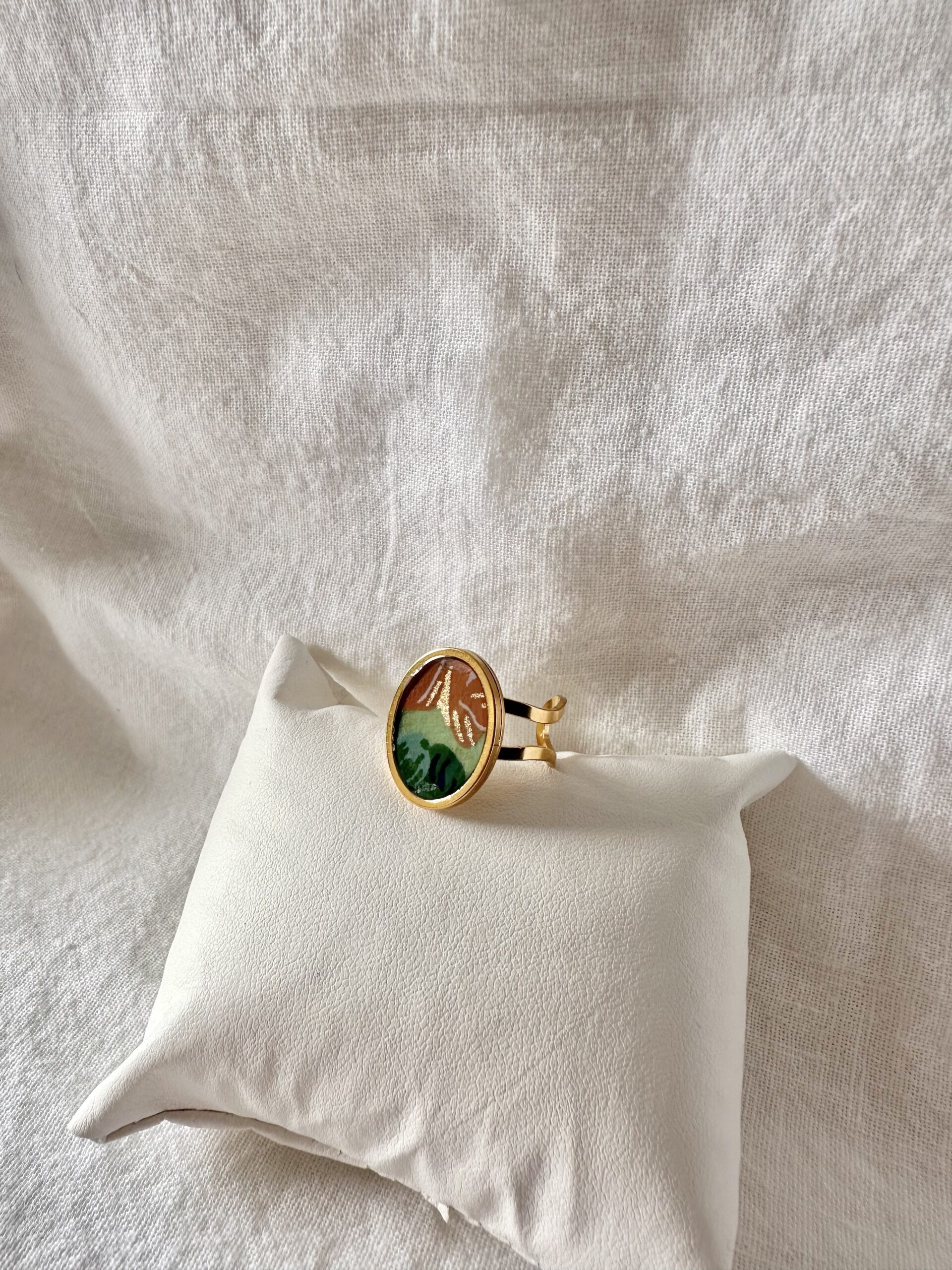 Bague élégante au design ovale, en acier inoxydable doré. La bague est ajustable à votre doigt. Son décor en papier de coton vert et rose est résiné pour une meilleure protection. Son design est original et contemporain, sa couleur profonde attire le regard.