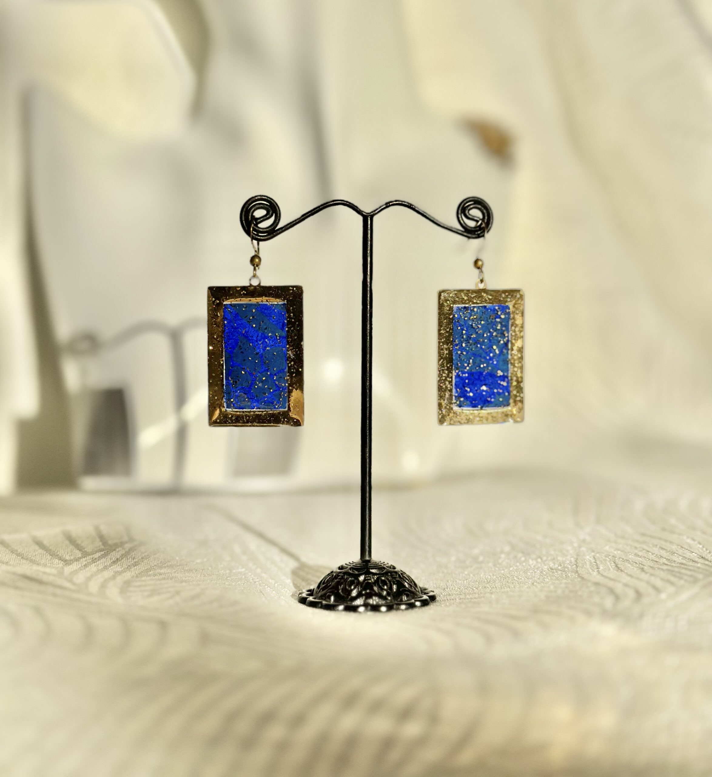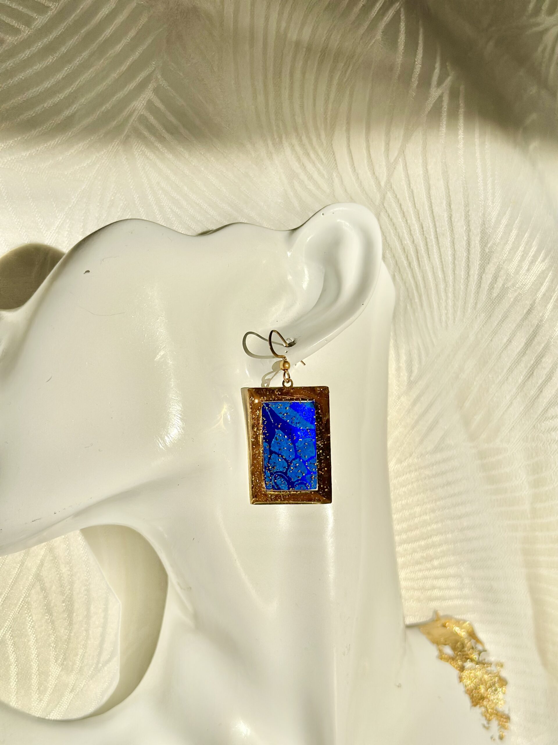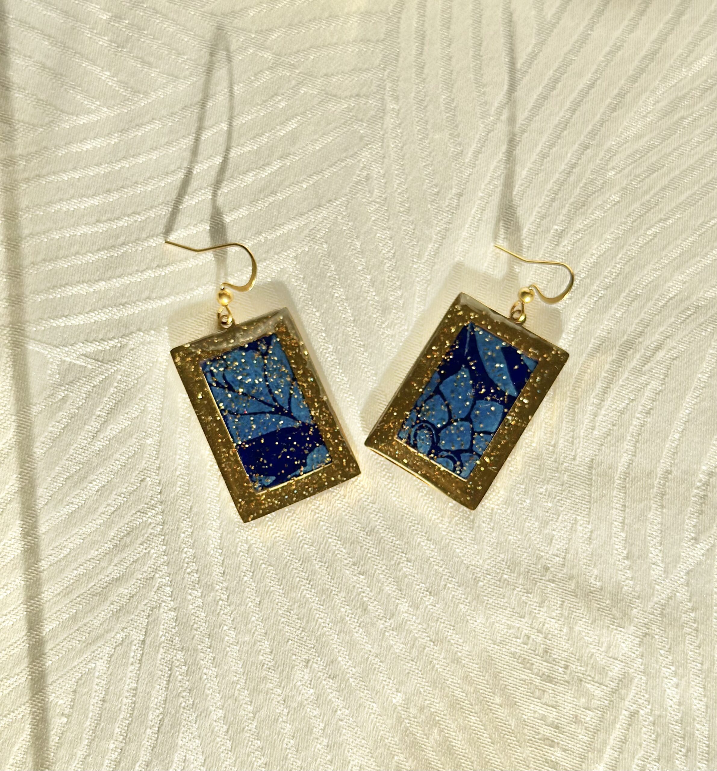 Chaque pièce est une création artisanale unique, mariant l’éclat d’un cadre doré à un insert texturé aux nuances bleues vertes. Le papier Népalais au décor de feuillage est recouvert d’une fine couche de résine ce qui en fait un bijou à la fois raffiné et artistique. Les crochets sont également en acier.