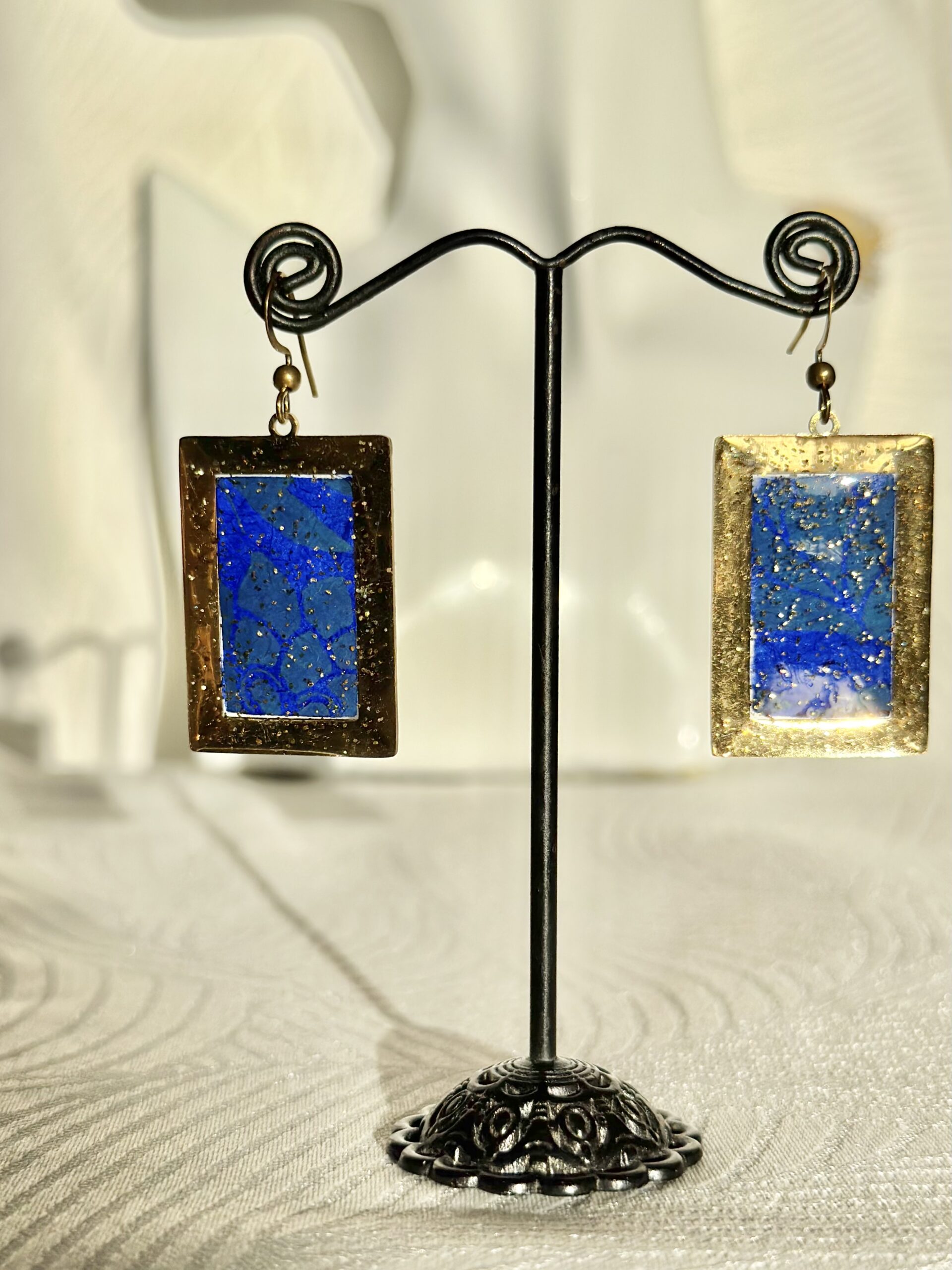 Boucles d’oreilles acier inoxydable avec en son centre un papier Népalais bleu et paillettes.