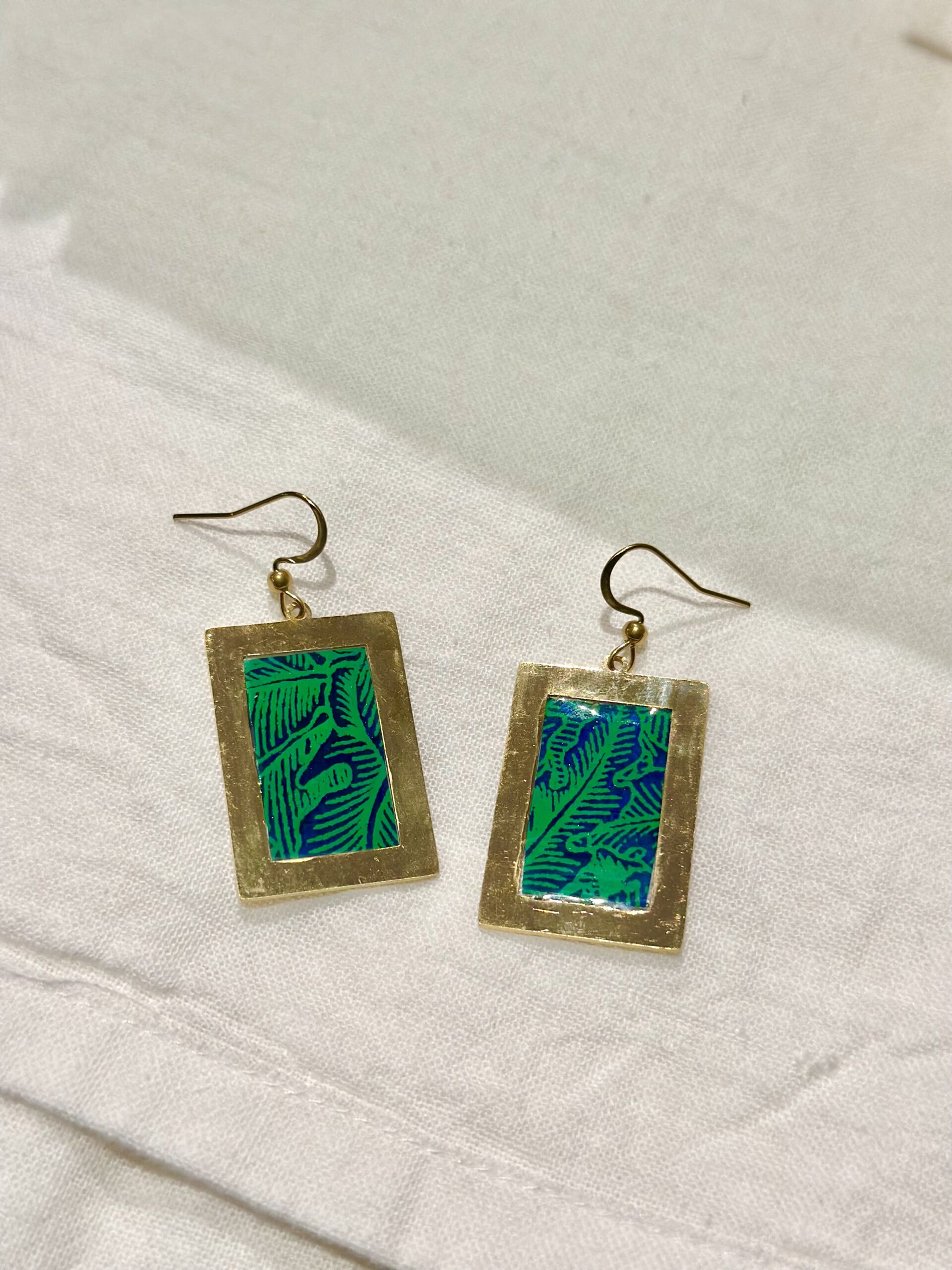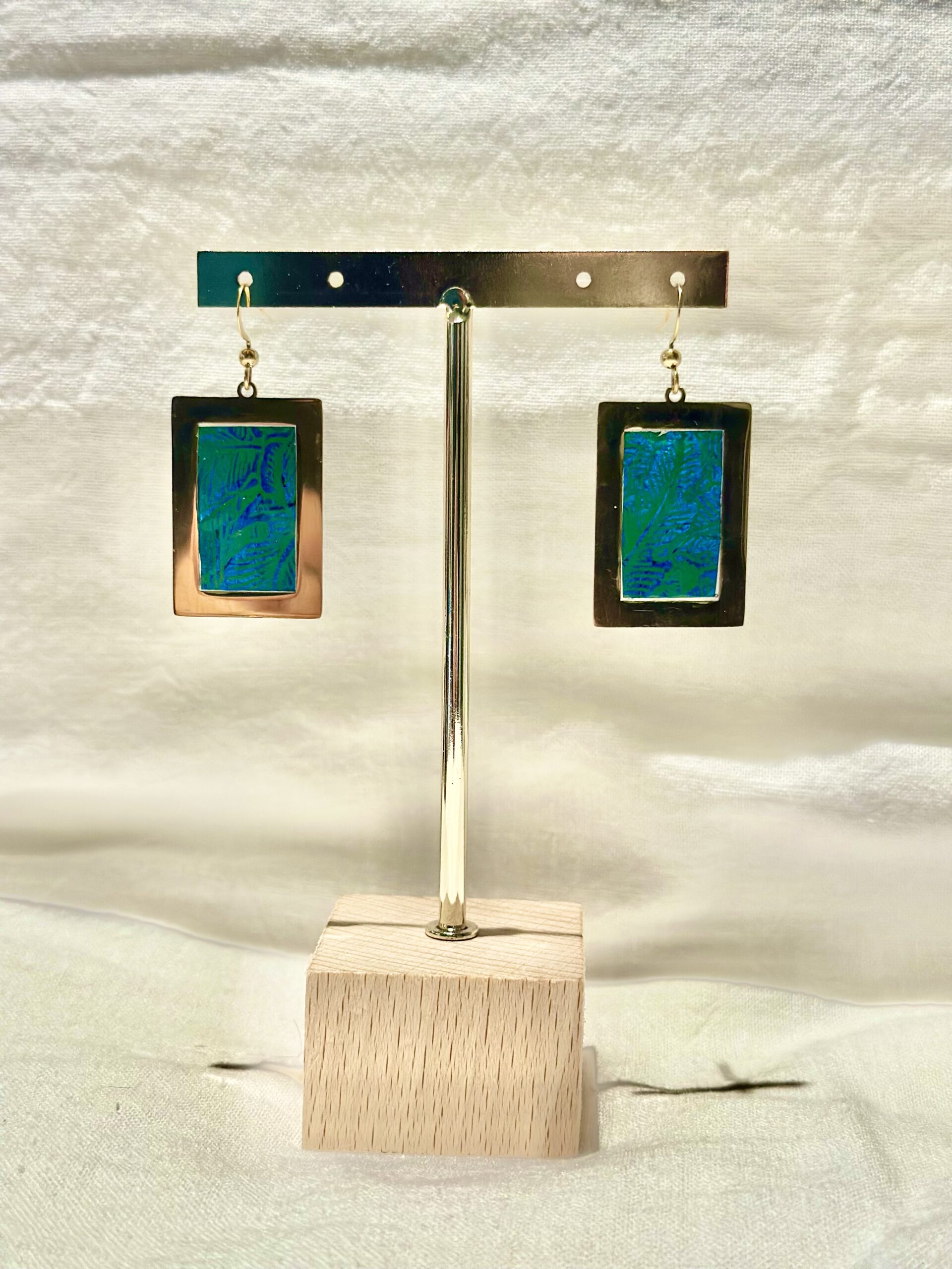 Chaque pièce est une création artisanale unique, mariant l’éclat d’un cadre doré à un insert texturé aux nuances bleues vertes. Le papier Népalais au décor de feuillage est recouvert d’une fine couche de résine ce qui en fait un bijou à la fois raffiné et artistique. Les crochets sont également en acier.