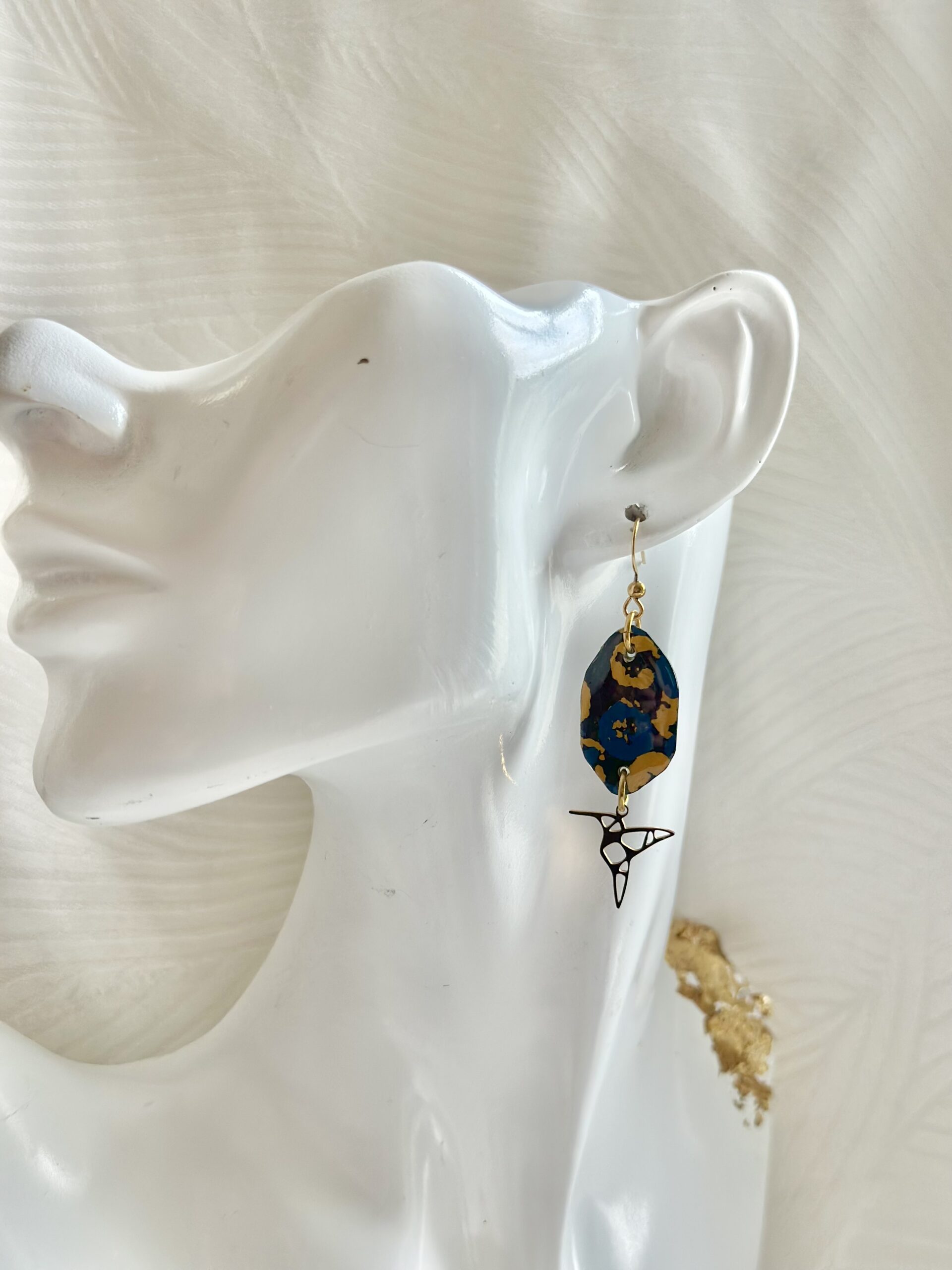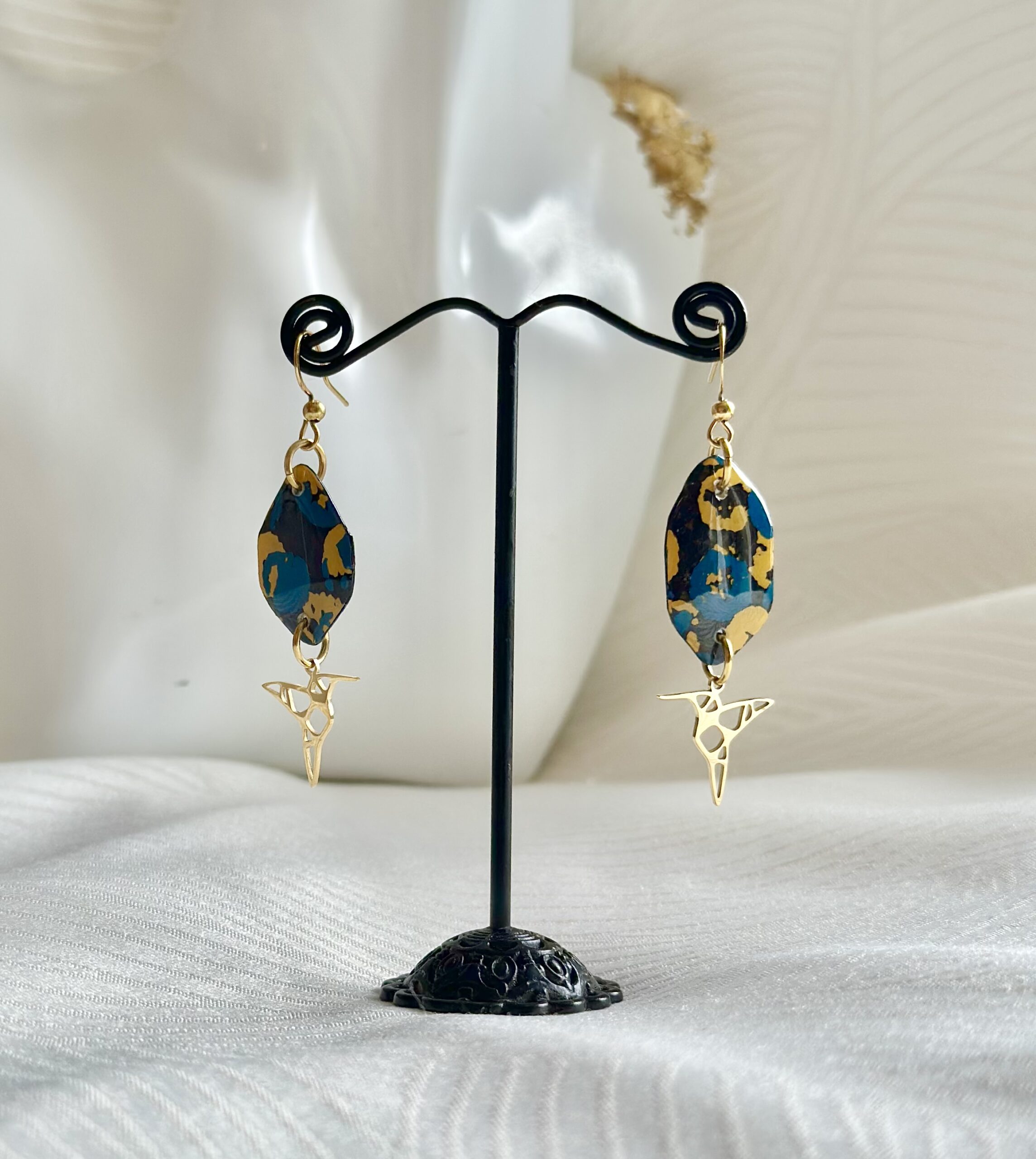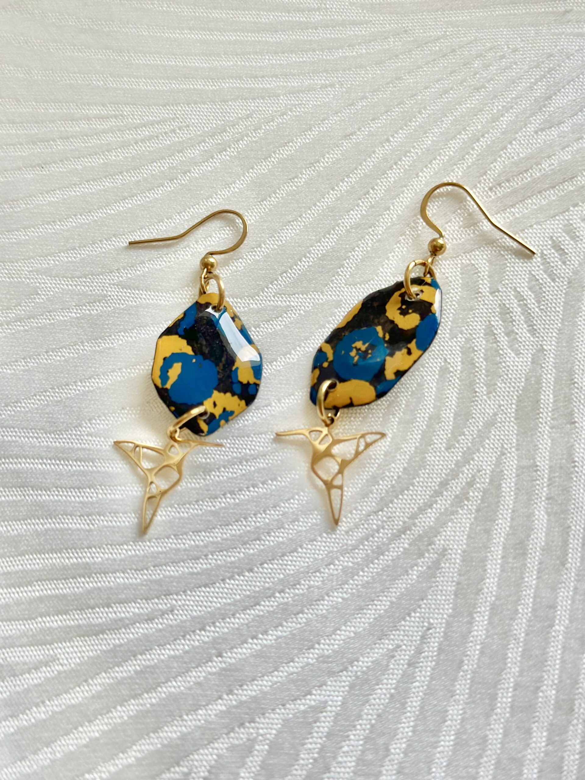 Cette paire de boucles d’oreilles asymétriques est réalisée en papier népalais sur fond marron foncé, jaune moutarde et bleu. Les éléments en papier résiné, sont asymétriques, légers et uniques.
