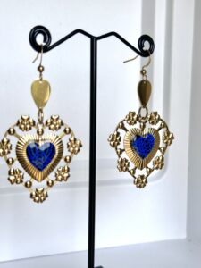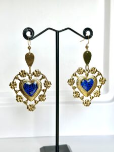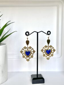 Sublimez votre style avec ces boucles d’oreilles cœur en métal doré, ornées d’un papier Népalais bleu roi résiné. Originales, élégantes et uniques, elles apportent une touche bohème chic à toutes vos tenues. Métal doré travaillé. Motif papier népalais bleu résiné. Fermoir crochet acier pratique.