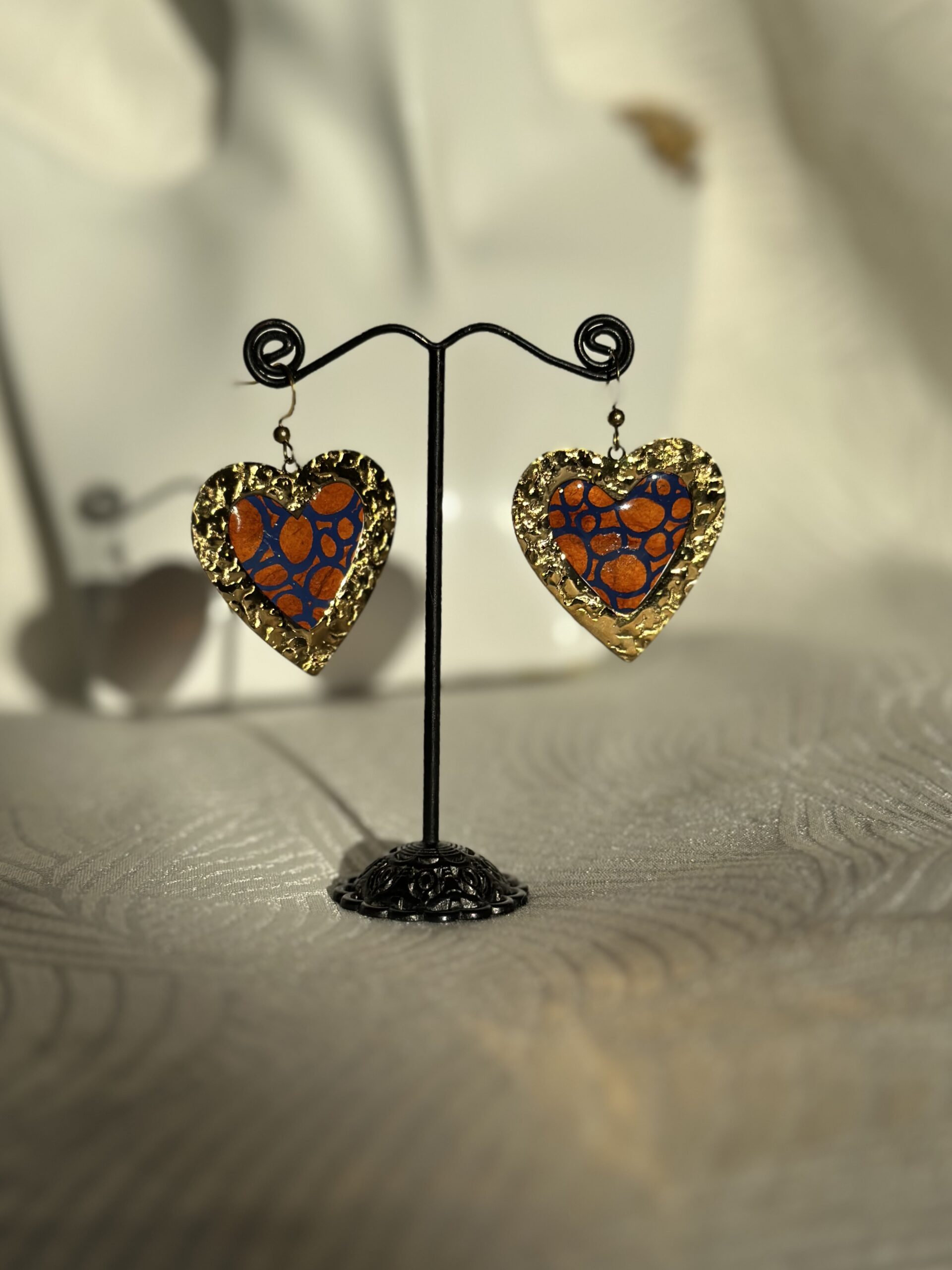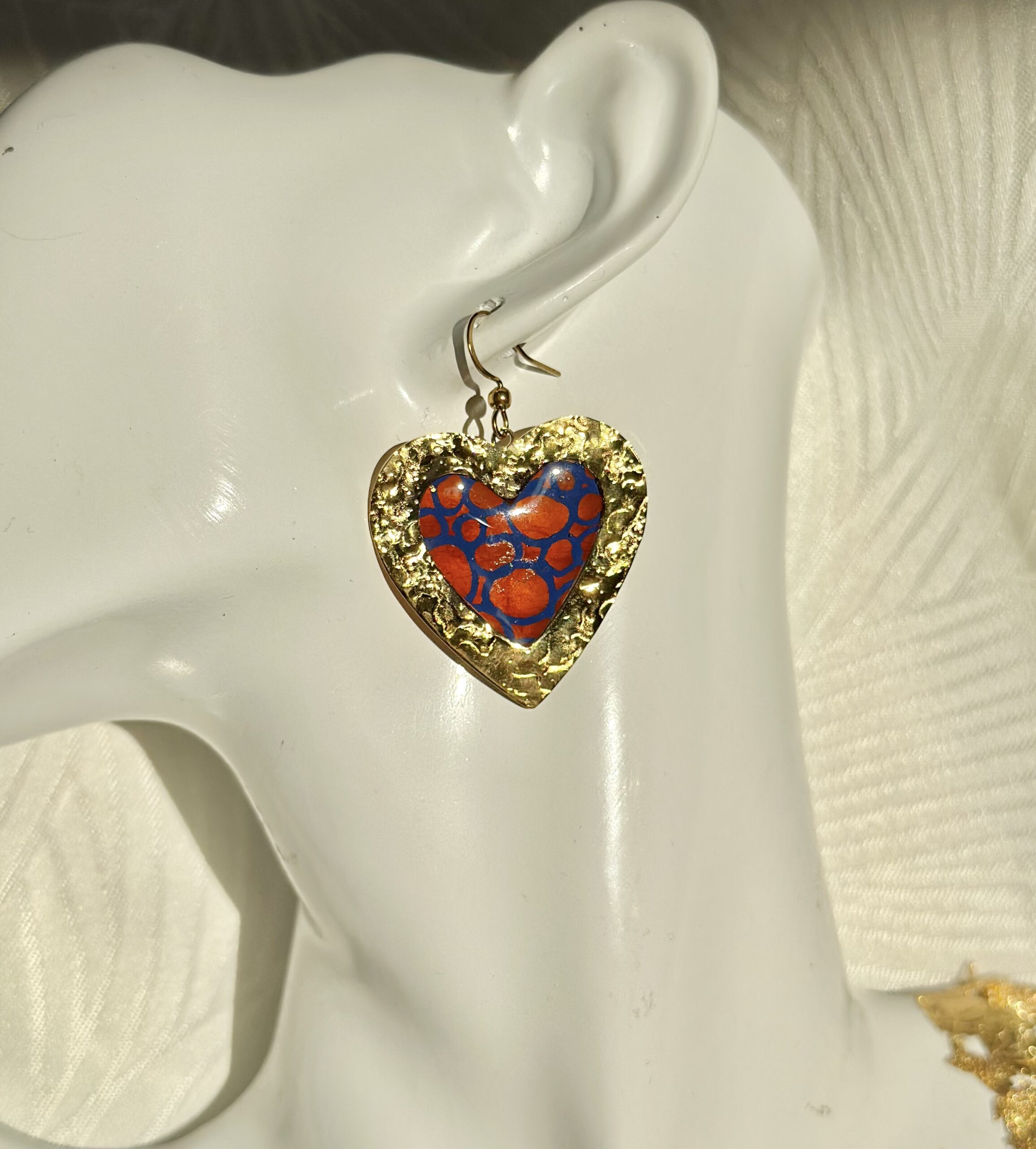 Boucles d’oreilles artisanales en acier doré martelé, en forme de cœur, ornées de papier népalais fait main aux motifs bleu et orange. Le papier est résiné pour une meilleure protection. Lumineuses et pleines de caractère, elles allient douceur et originalité. Chaque paire est unique, idéale pour apporter une touche chaleureuse et expressive à votre tenue.