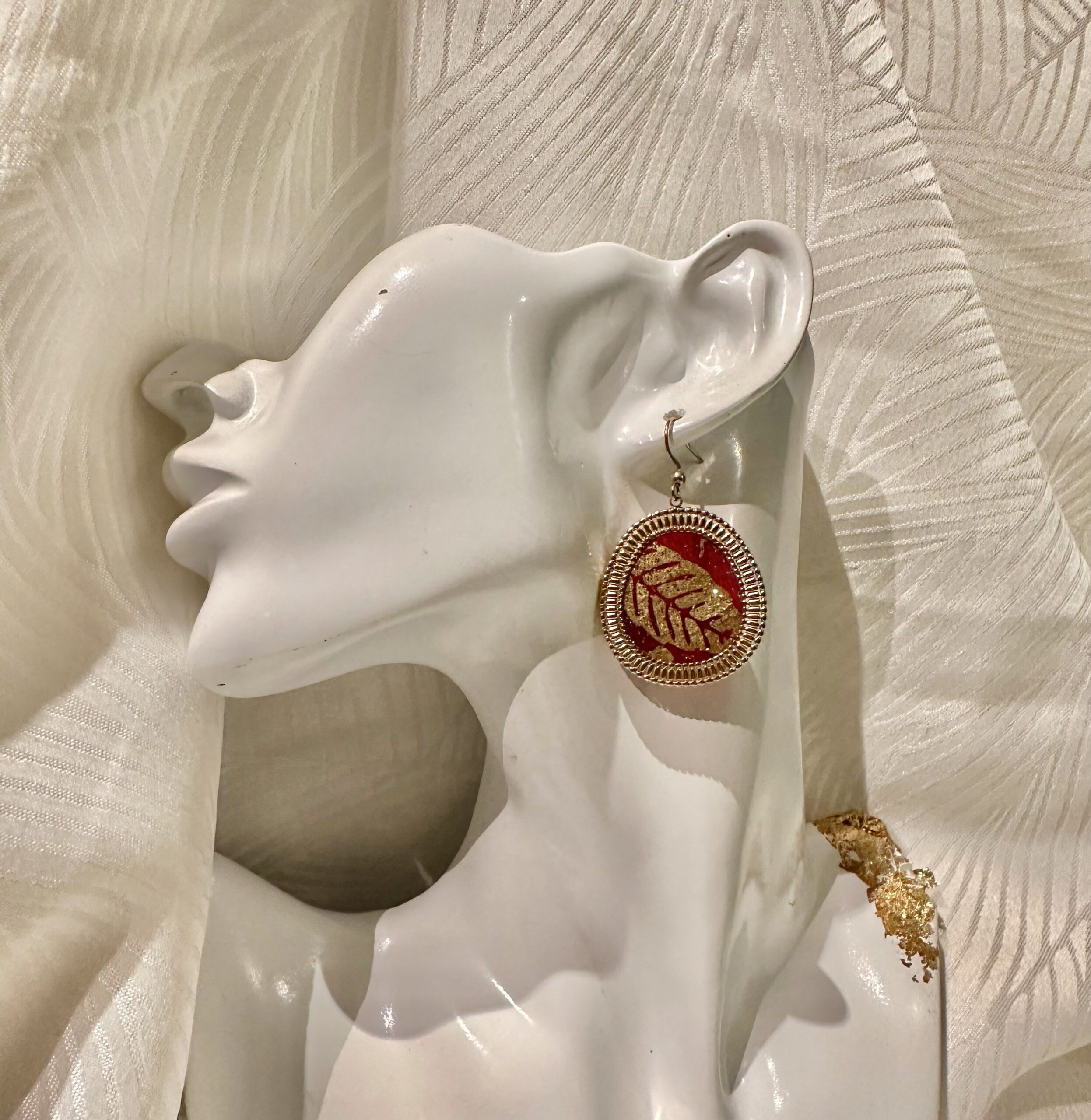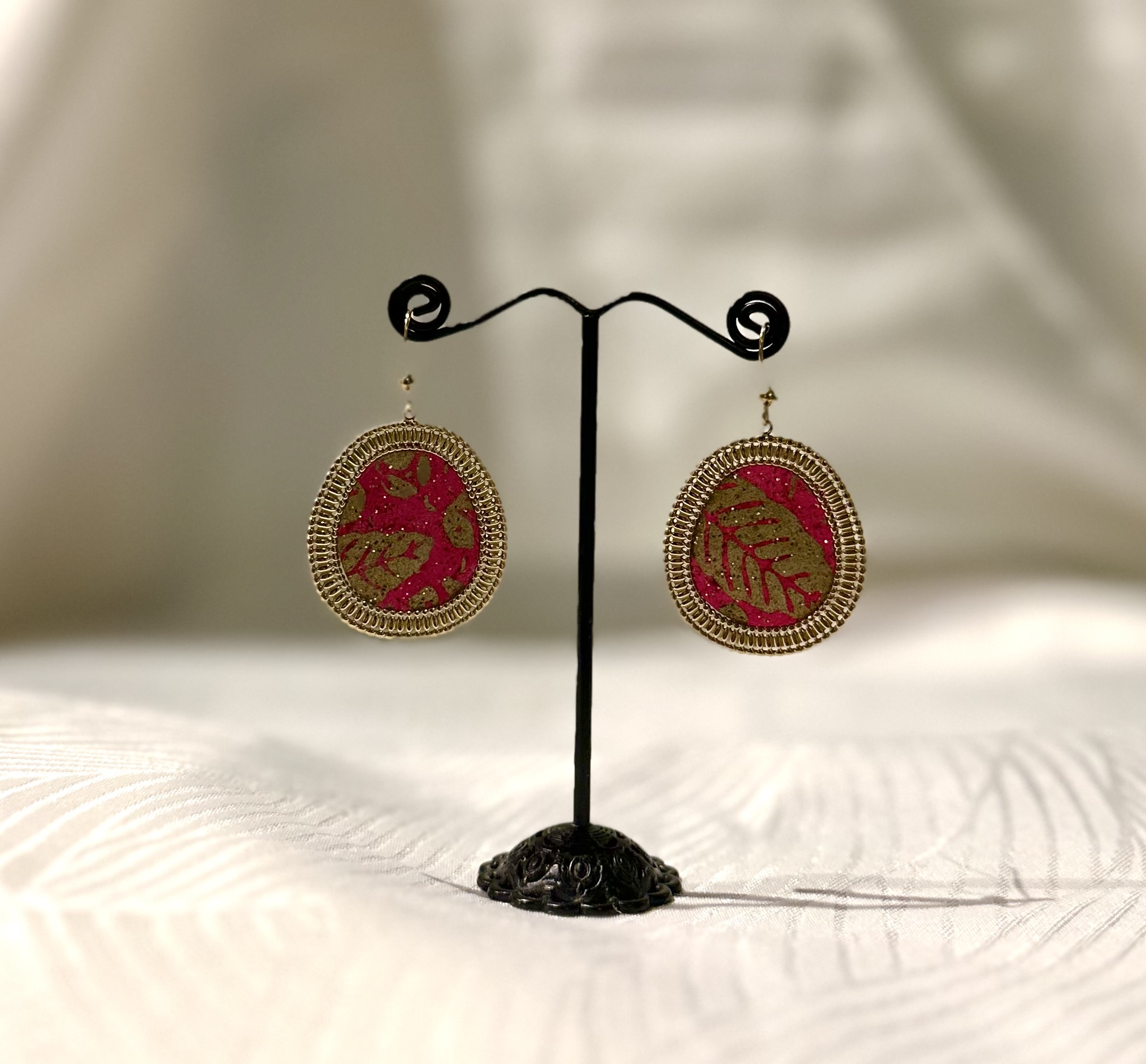 Boucles d’oreilles artisanales ornées de papier népalais fait main, aux motifs végétaux dorés sur fond rose Fuchsia. Le papier est délicatement serti dans un cadre ovale en acier travaillé et doré à l’or 18K, pour un bijou léger, élégant et original. Le papier résiné, agrémenté de quelques paillettes, bénéficie d’une transparence qui illumine le bijou.