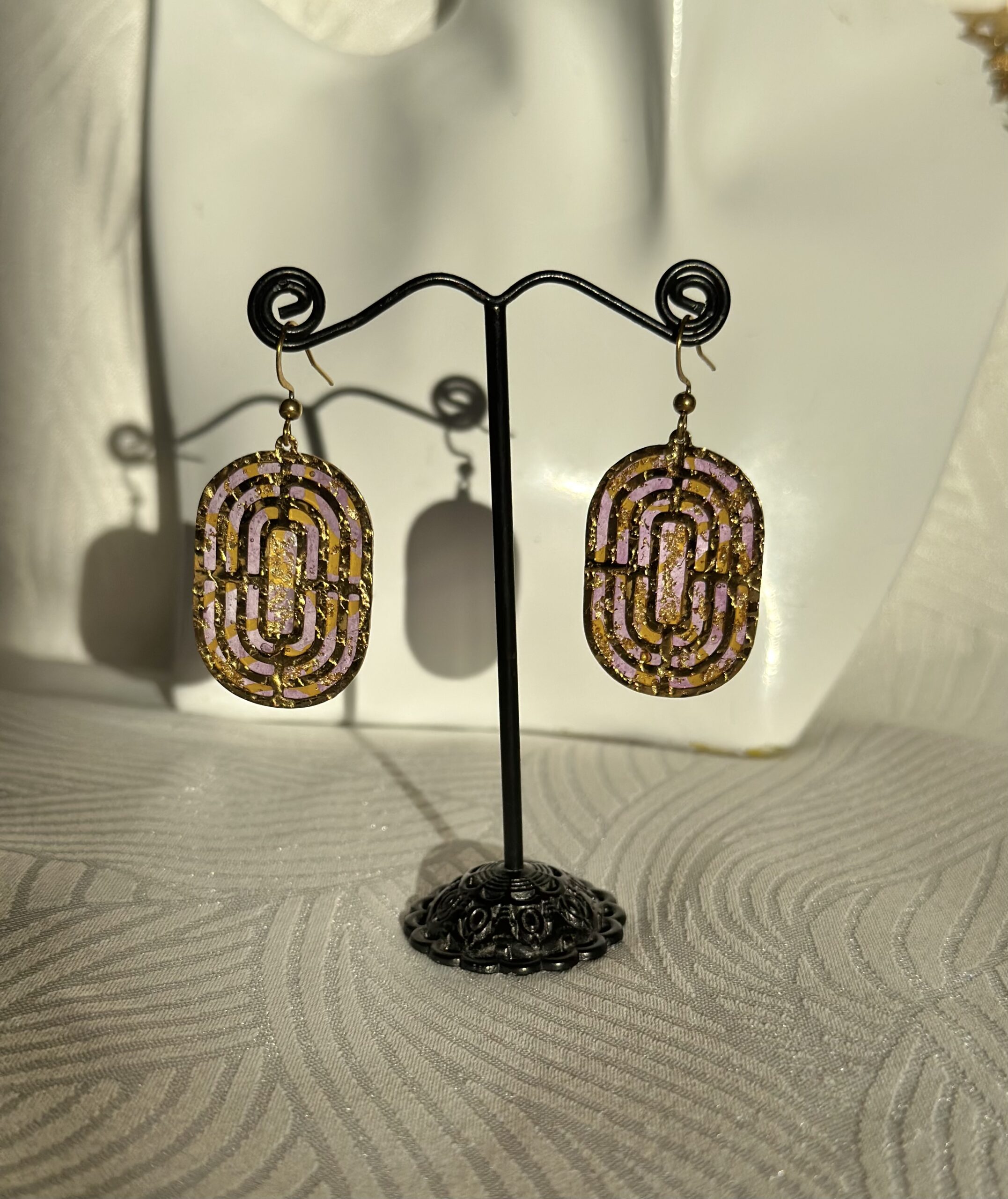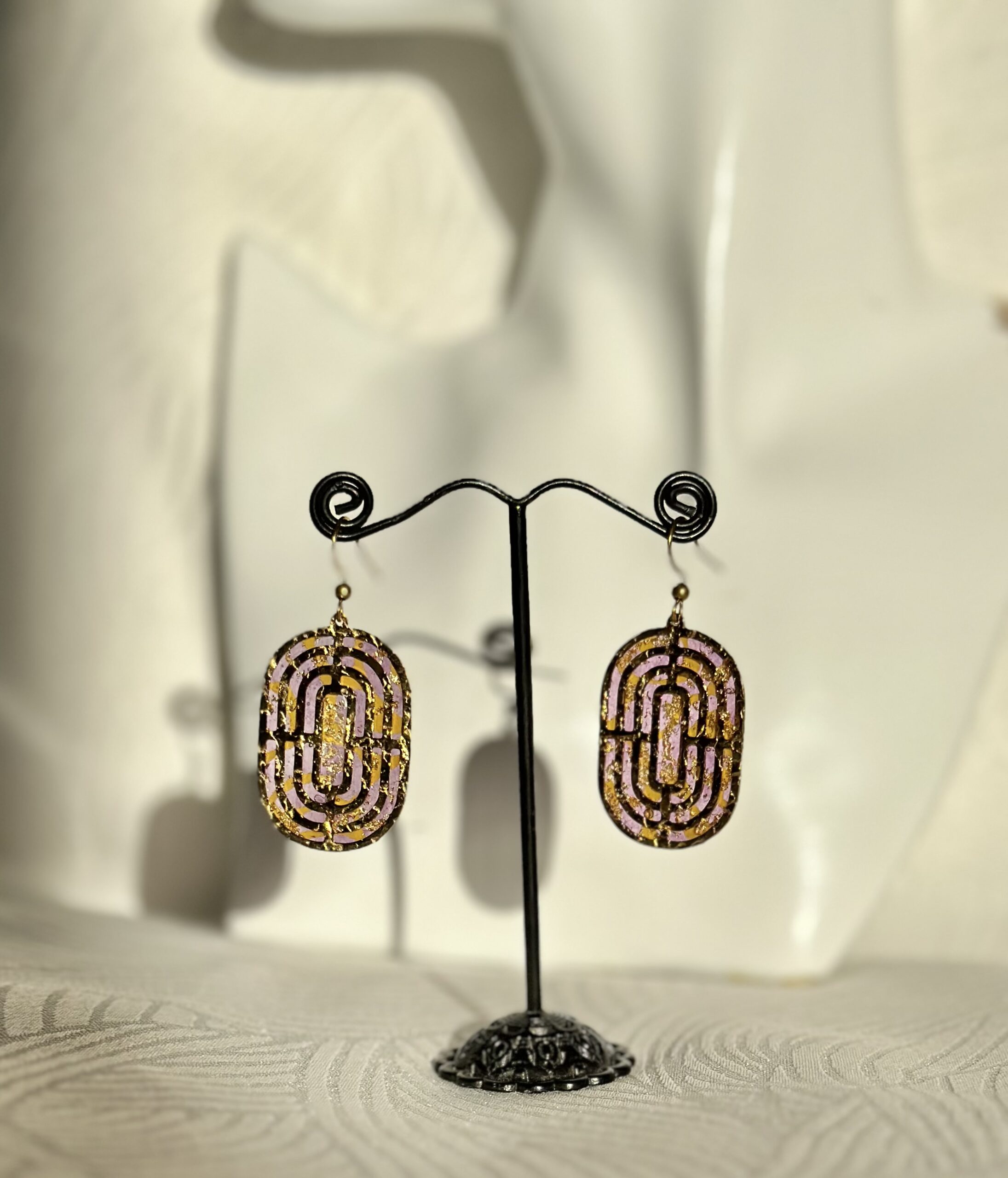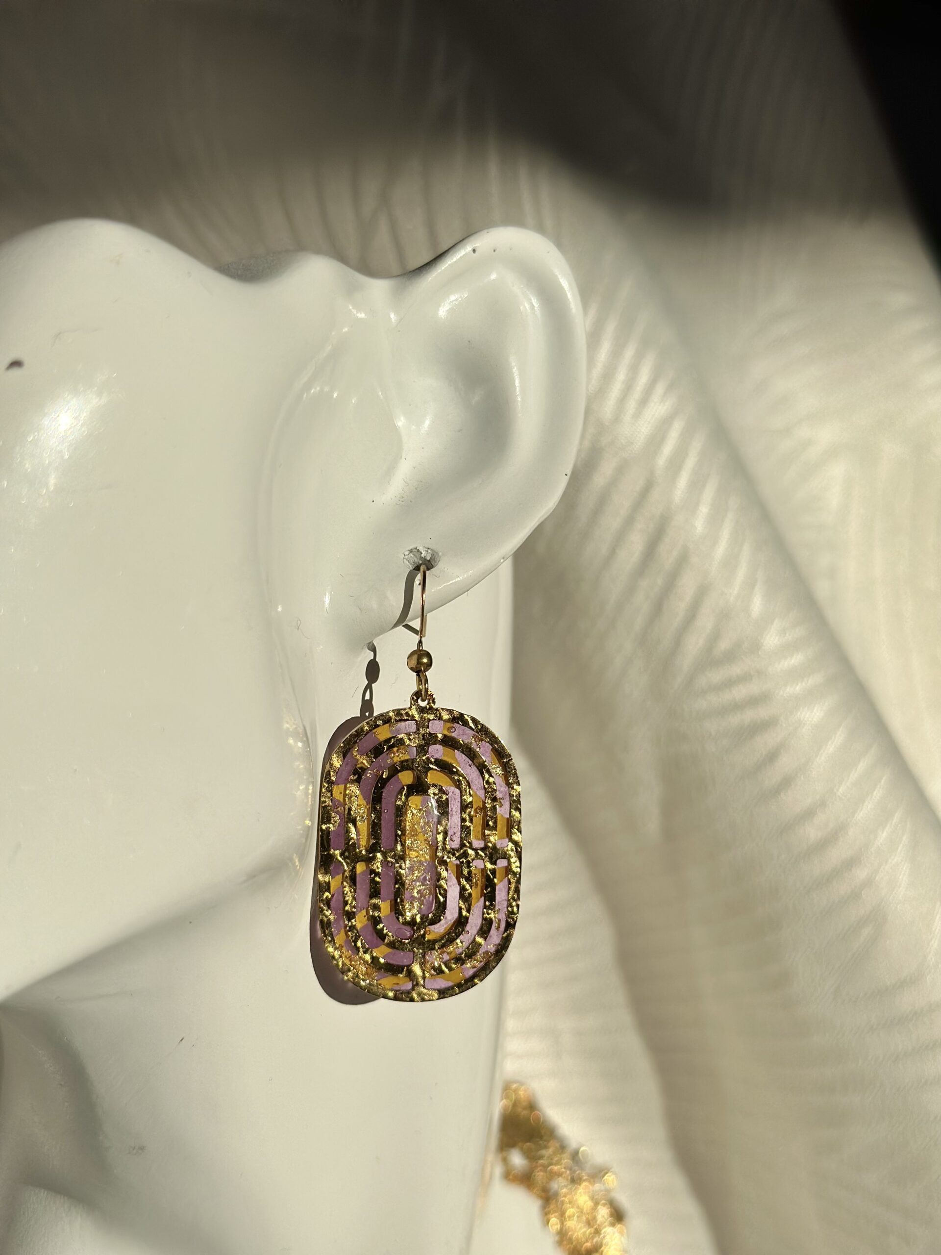 Boucles d’oreilles rectangulaires en acier inoxydable doré, décorées de papier Népalais aux tons rose et or, pour un style graphique et lumineux.