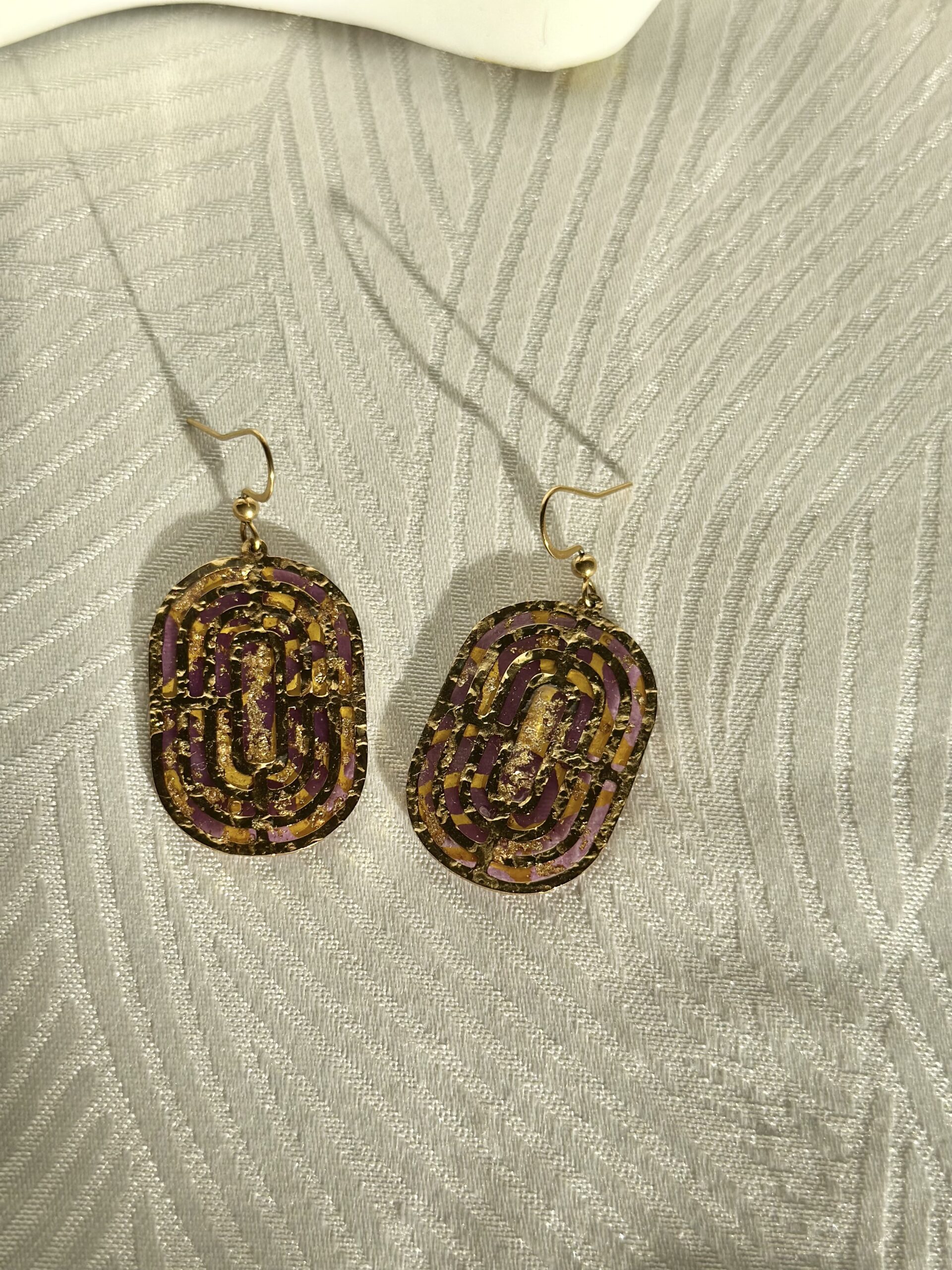 Les Pendentifs rectangulaires sont arrondis aux angles, avec un motif géométrique rose et dorées. L’acier martelé apporte un coté scintillant pour un rendu très artistique. Le papier Népalais, est protégé sous une fine couche de résine pour une bonne résistance au quotidien et des couleurs durables. Les boucles sont montées sur crochets en acier inoxydable doré, légers et confortables, ces boucles d’oreilles sont idéales pour apporter une note originale et moderne à vos tenues, du quotidien aux soirées.