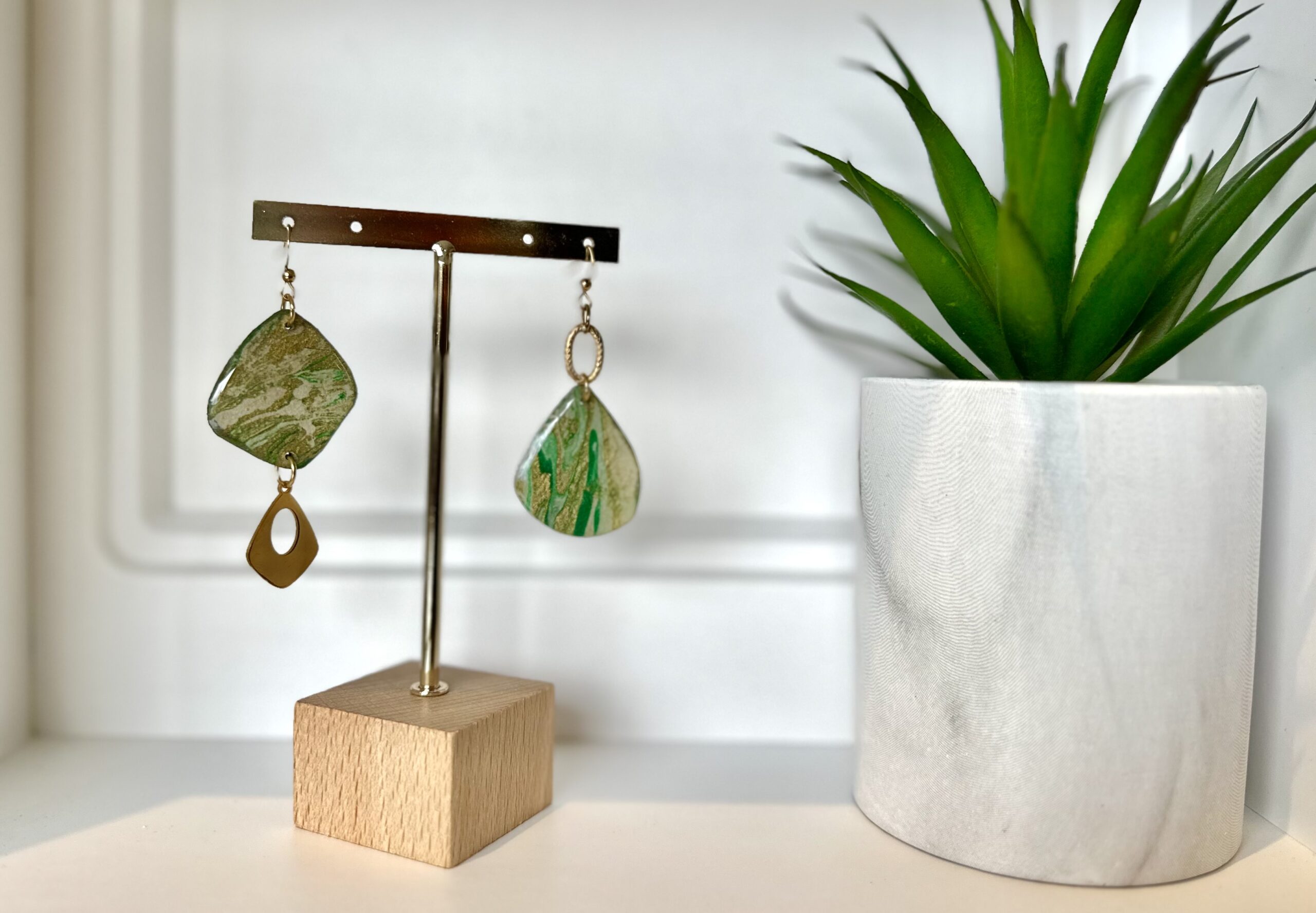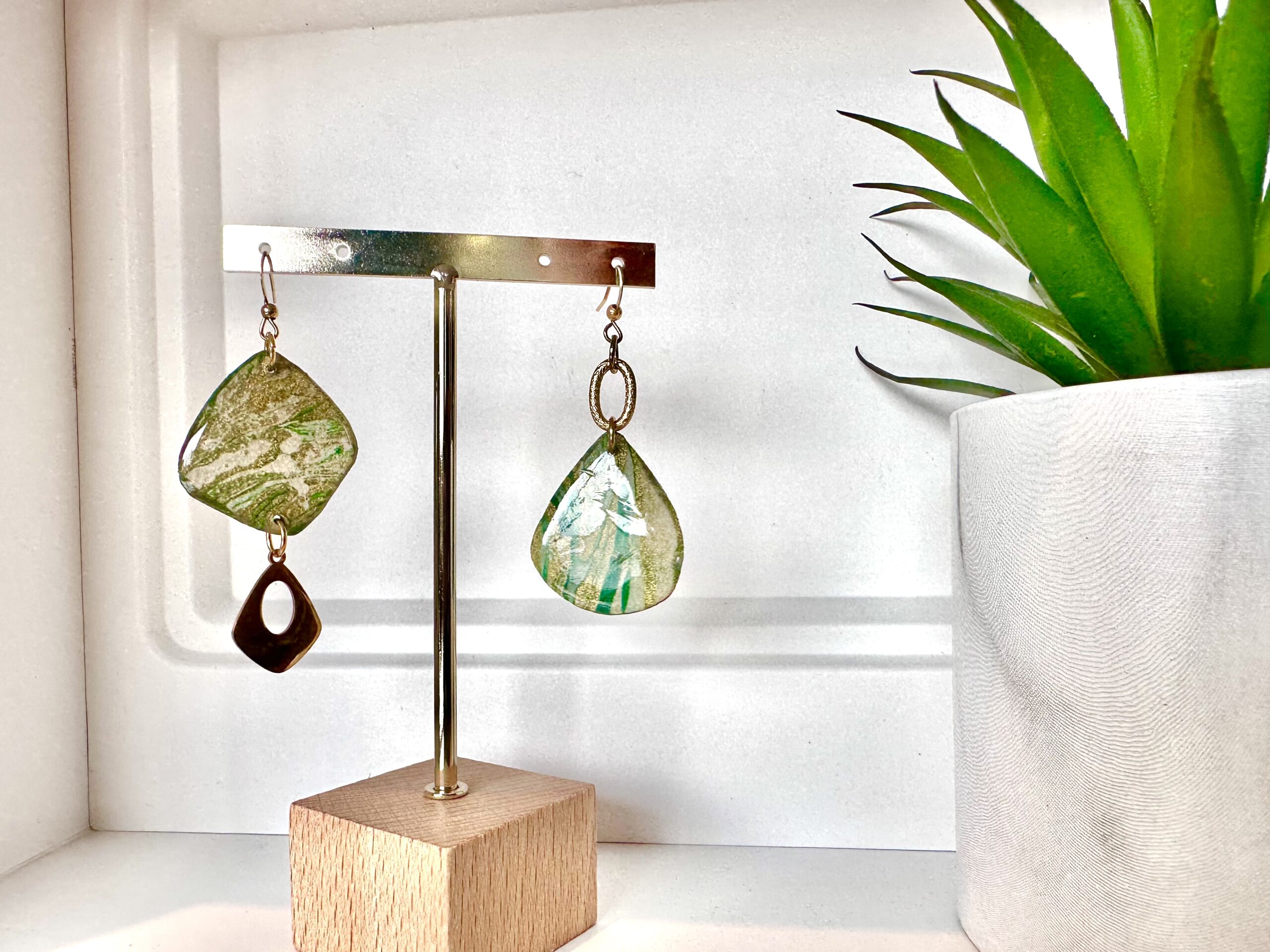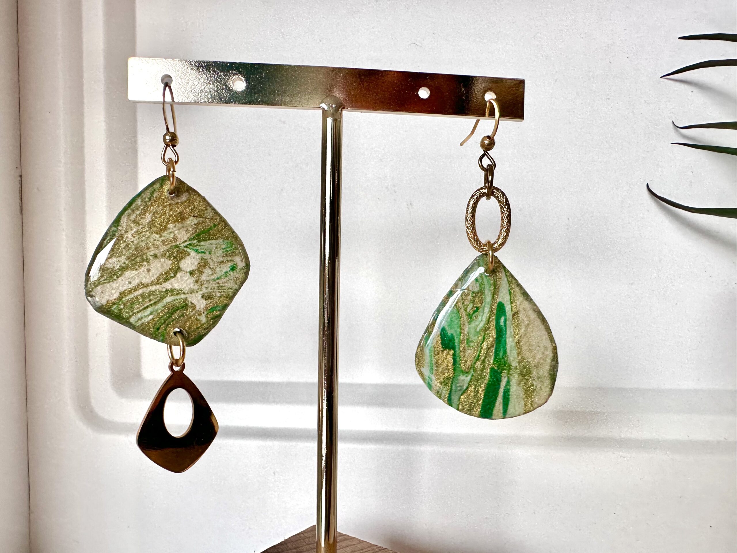Ces boucles d’oreilles asymétriques et légères sont en papier Népalais. Ce magnifique papier est un papier artisanal effet marbré vert et doré. Il est ensuite résiné pour une meilleure protection. Il est agrémenté de breloques en acier inoxydable. Cette association de matériaux donne à cette paire de boucles d’oreilles un style élégant, original, et chic.