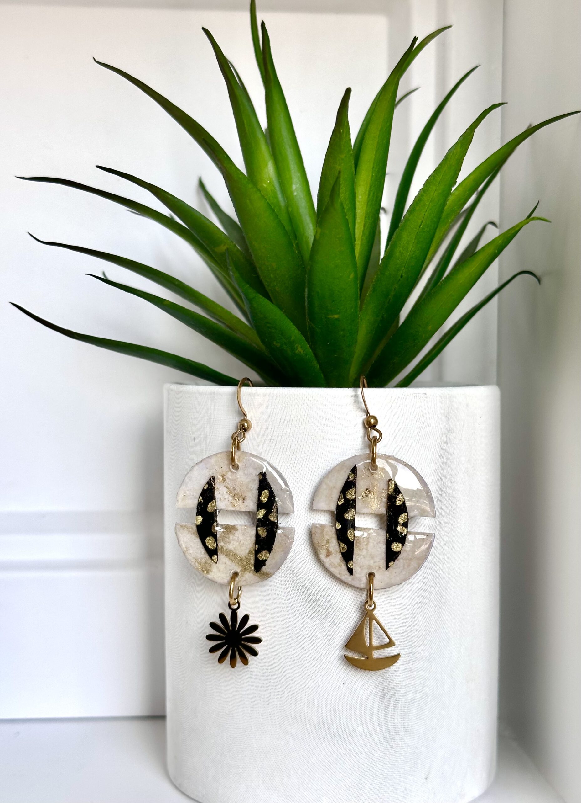 Ces boucles d’oreilles asymétriques et légères sont en papier Népalais Recyclé. Je garde les chutes de papier pour les transformer. Ce magnifique papier est un papier artisanal effet marbré blanc et doré. Les décorations verticales sont en papier Népalais noir et doré à pois. Il est ensuite résiné pour une meilleure protection. Il est agrémenté de breloques en acier inoxydable (Fleur et bateau). Cette association de matériaux donne à cette paire de boucles d’oreilles un style élégant, original, et chic.