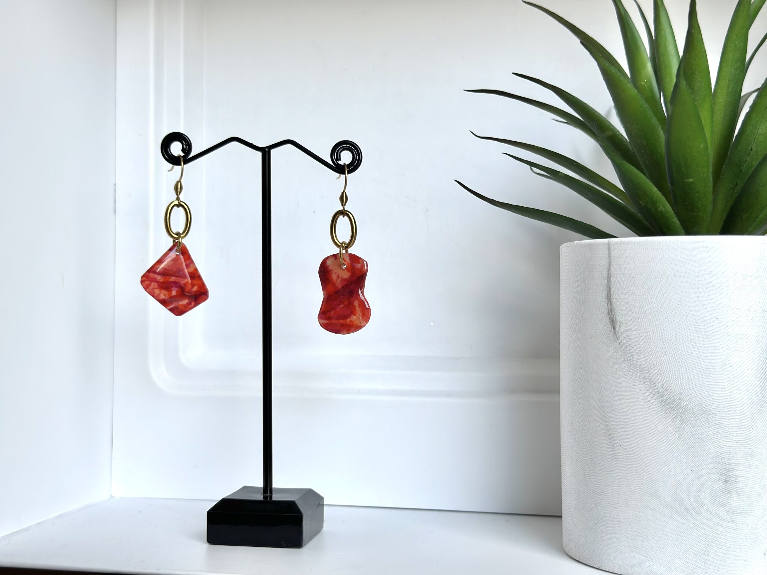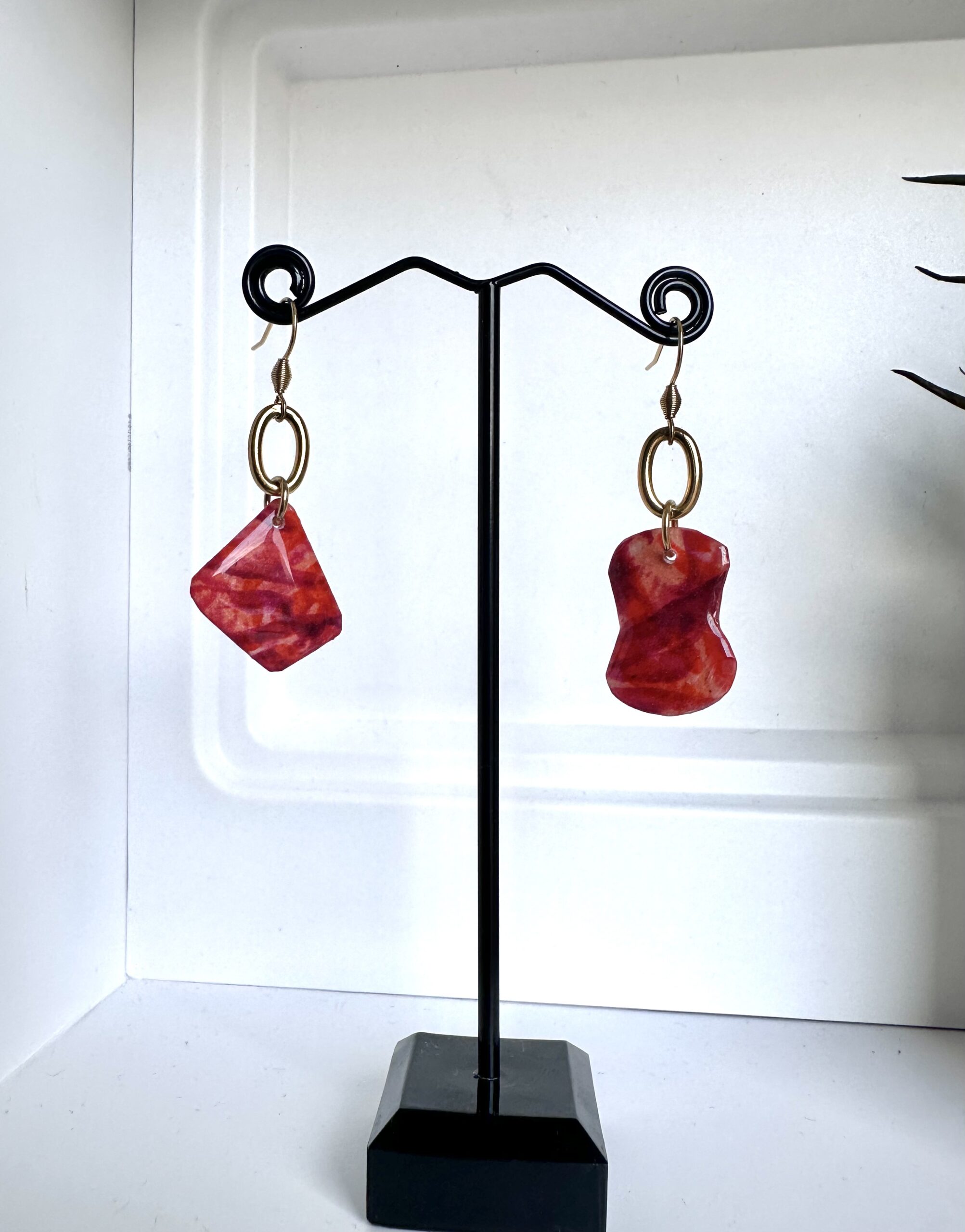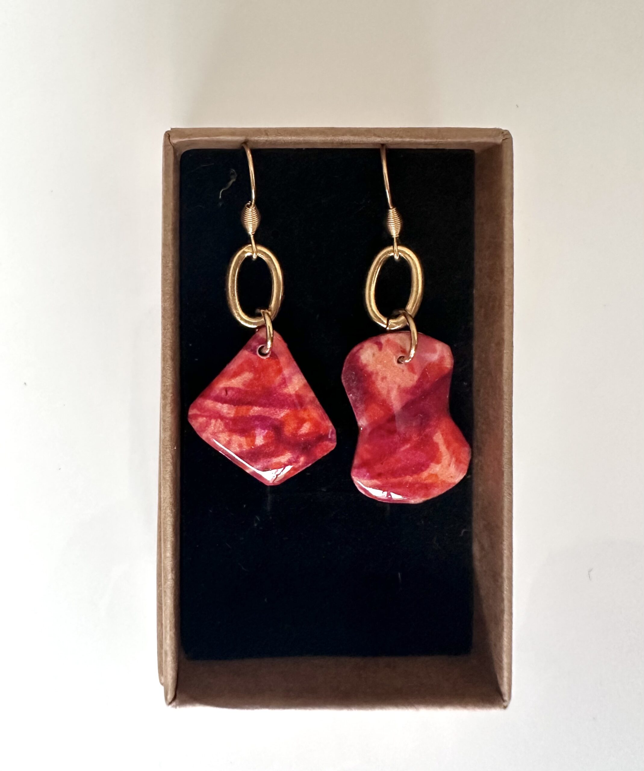 Ces boucles d’oreilles uniques asymétriques et légères sont en papier Népalais. Ce magnifique papier est un papier artisanal effet rose fushia travaillé sur des formes différentes. Il est ensuite résiné pour une meilleure protection. Il est agrémenté de breloques en acier inoxydable doré. Cette association de matériaux donne à cette paire de boucles d’oreilles un style élégant, original, et chic.