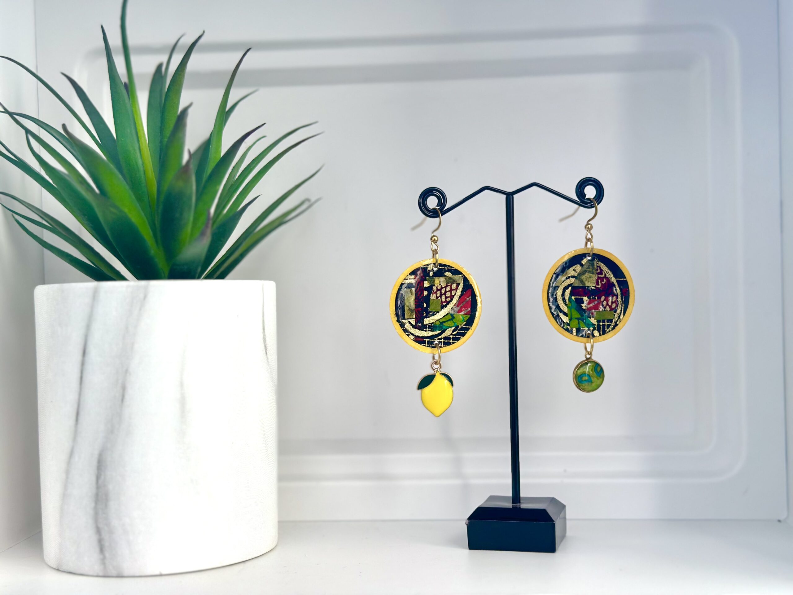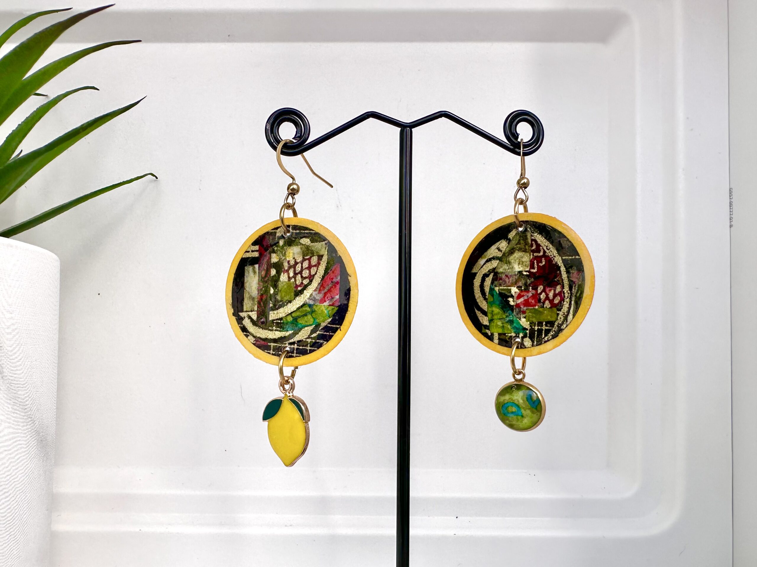 Ces boucles d’oreilles originales sur fond jaune, sont faites de récupération de papier Népalais. Parce que tout se recycle, j’utilise les chutes de papiers pour en faire une mosaïque (ou patchwork). Le tout est résiné pour plus de solidité. Mais j’utilise une couche très fine style vernis ce qui peut avoir quelques irrégularités au touché ce qui est tout à fait normal.