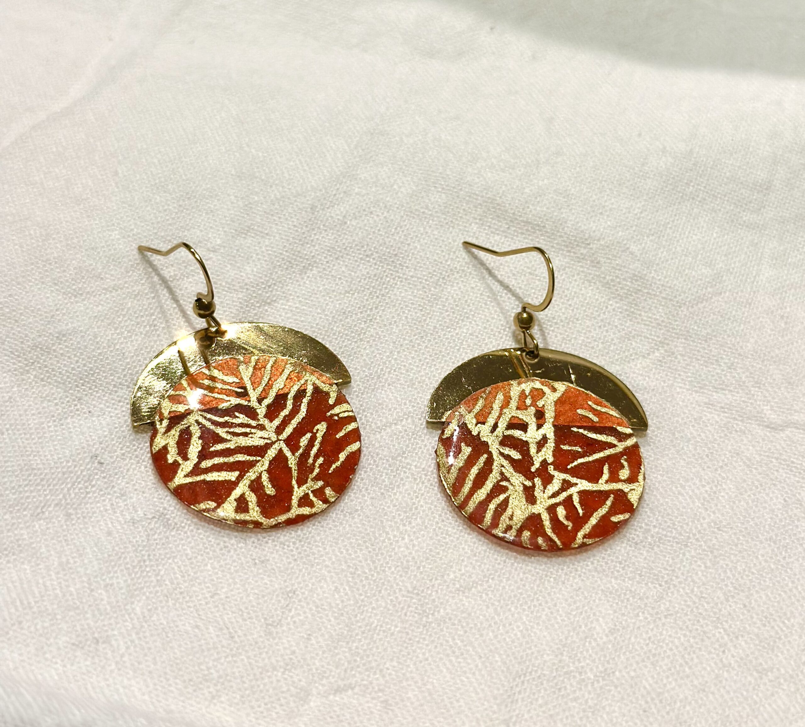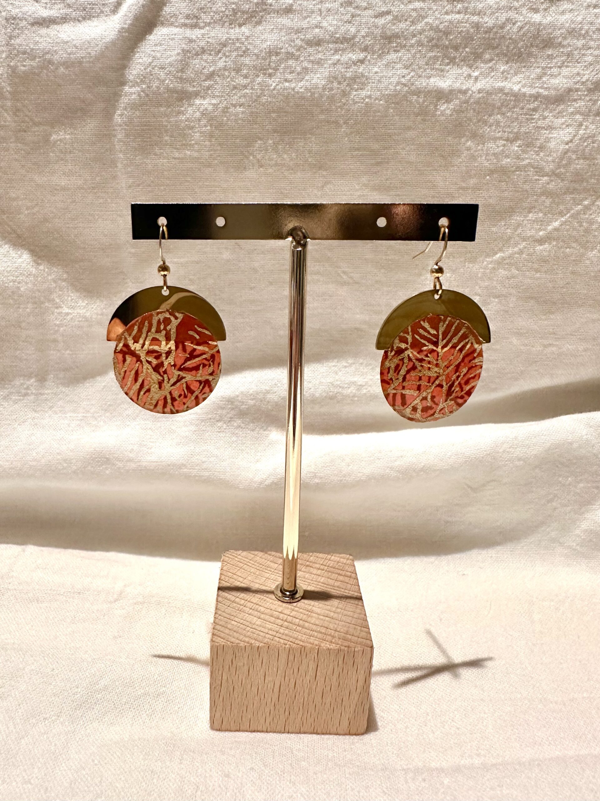 Boucles d’oreilles rondes en acier et papier népalais rose orangé puis résiné.