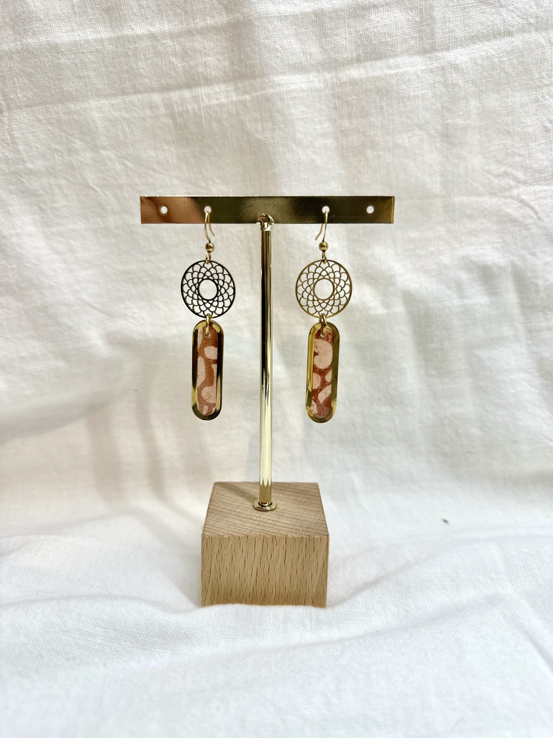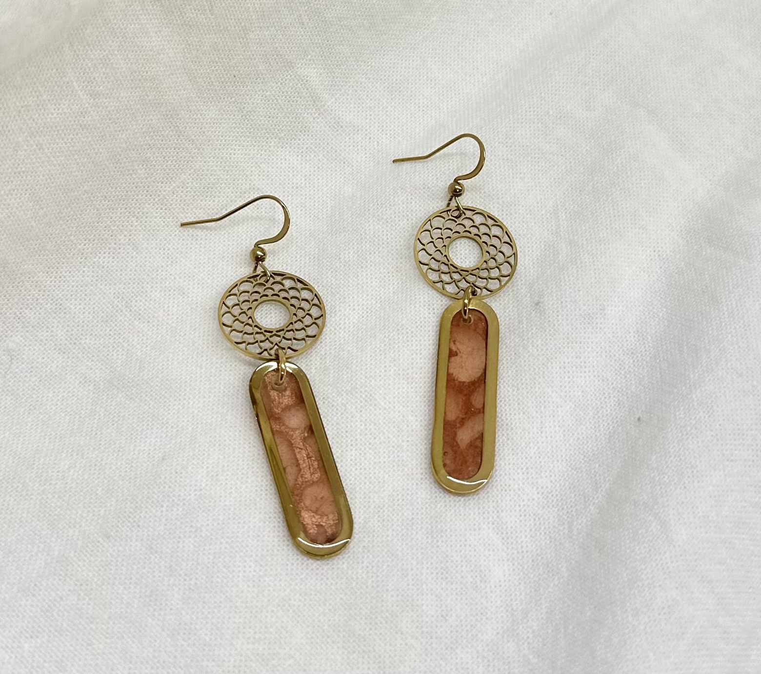 Boucles d’oreilles en acier inoxydable et papier Népalais . La paire de boucles d’oreilles est composée de deux parties. La première, une breloque en acier inoxydable en forme de rosace. La deuxième, une breloque en acier décorée d’un papier Népalais rose orangé et résiné pour une meilleure protection.