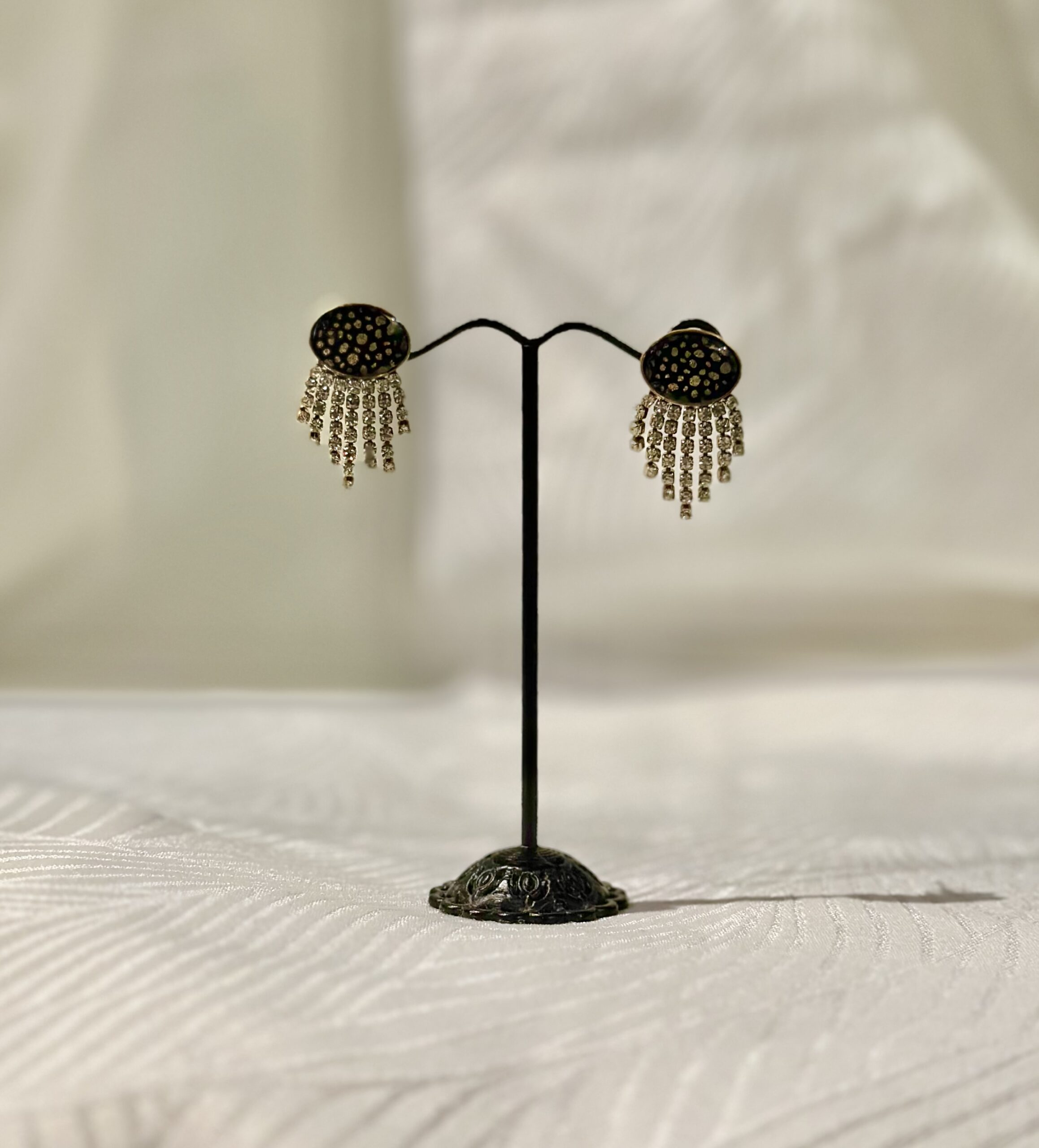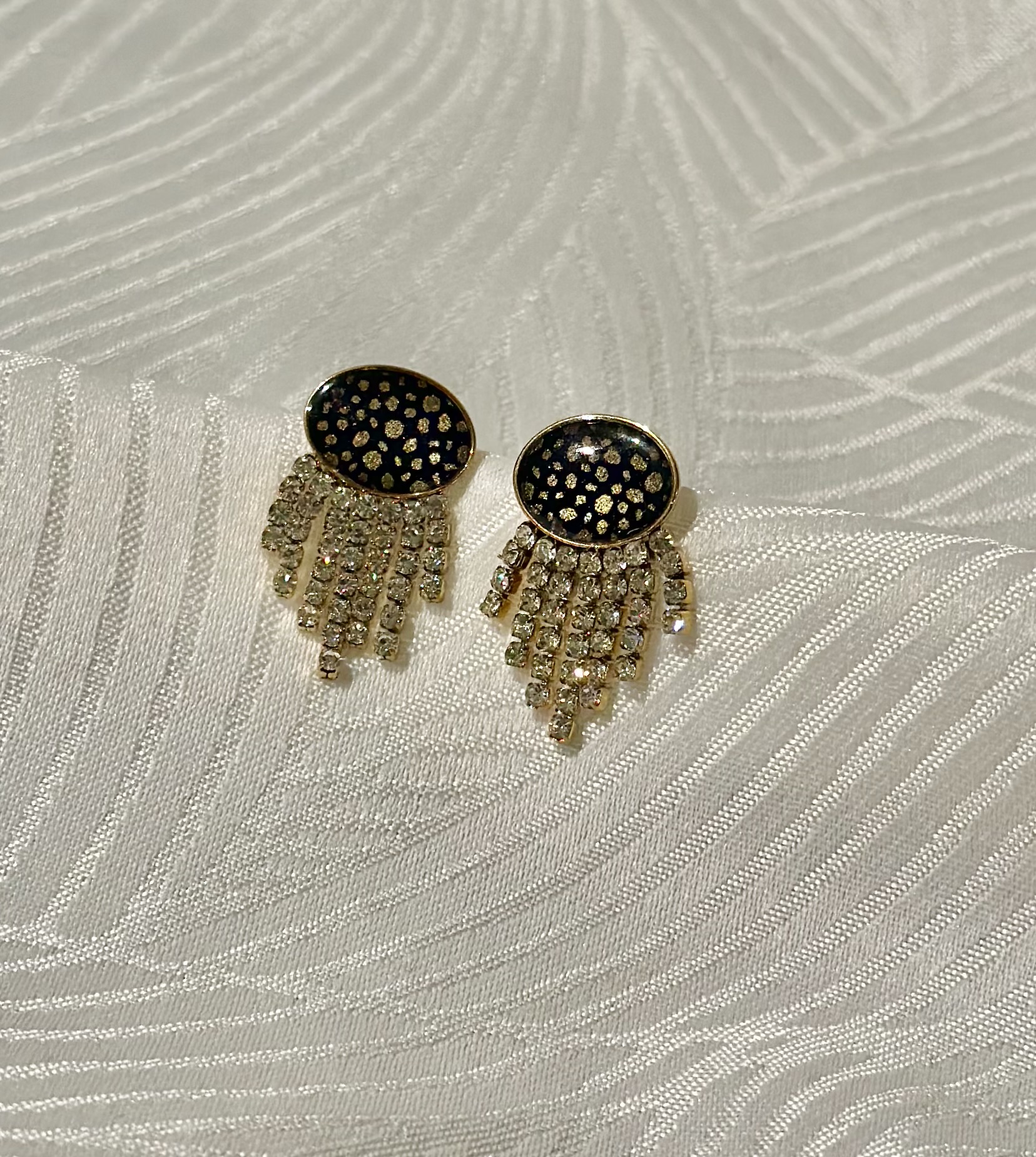 Boucles d’oreilles élégantes composées d’un décor en papier népalais bleu marine à pois dorés résiné, surmonté d’un encadrement en acier. De fines chaînettes ornées de strass apportent brillance et mouvement à l’ensemble.