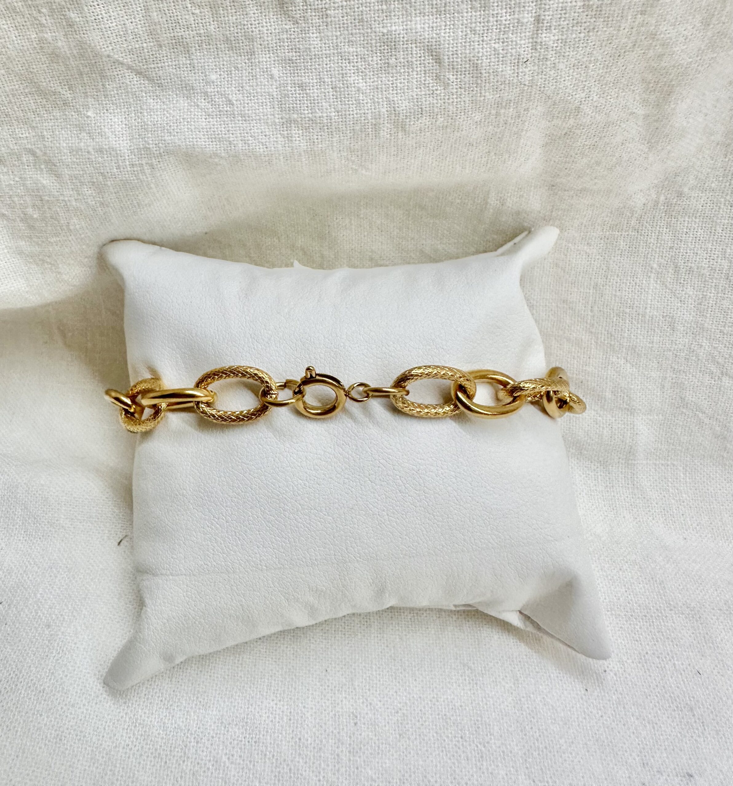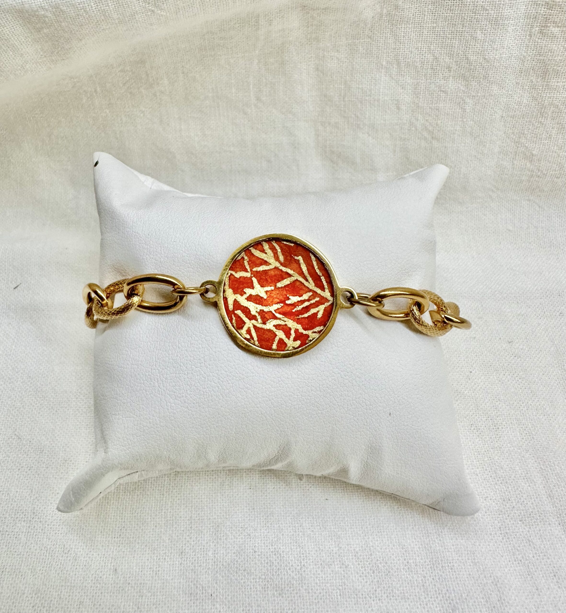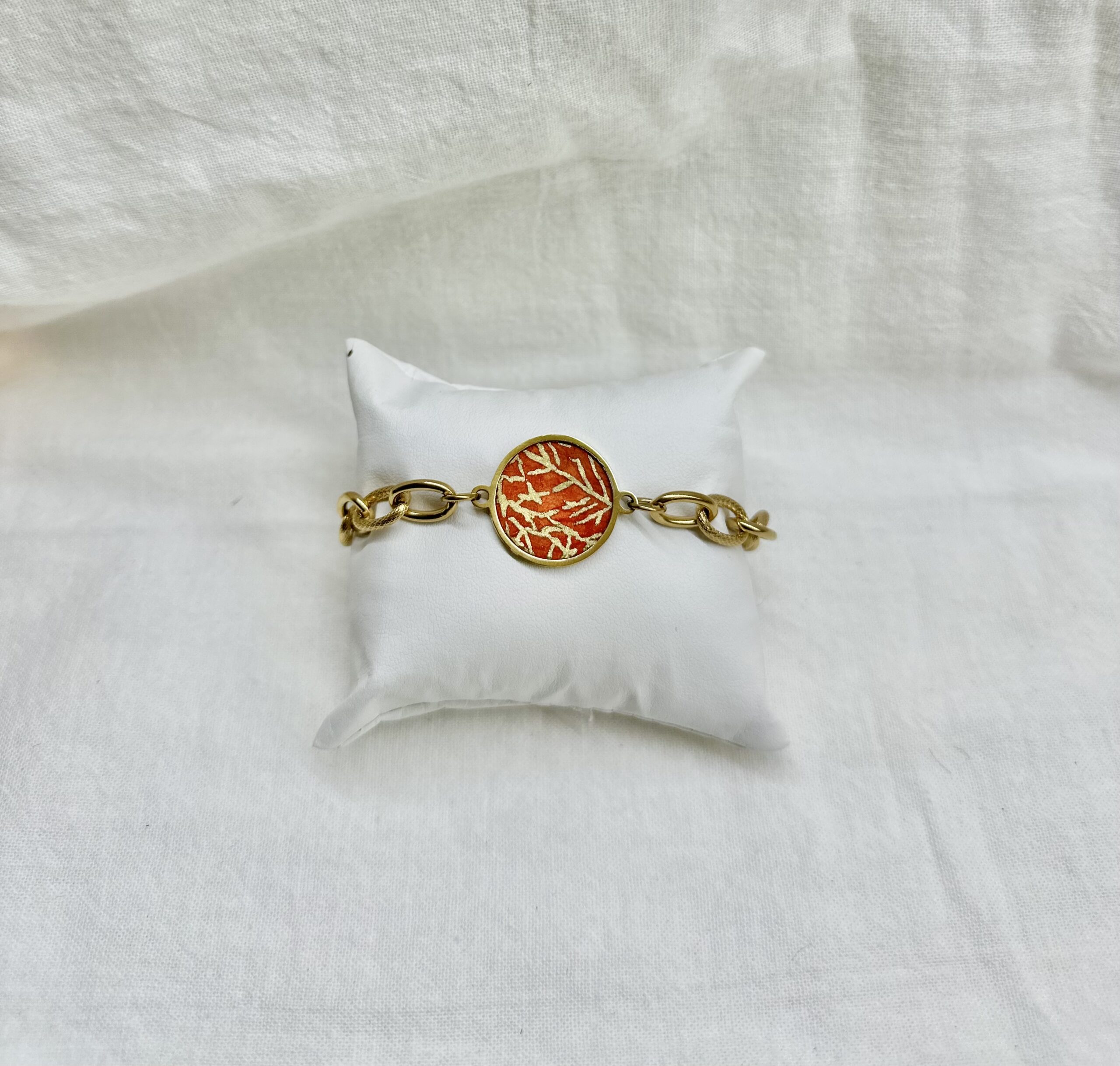 Magnifique bracelet en acier inoxydable doré. La Chaîne est composée de gros maillons qui lui donne un style moderne. Au centre un médaillon rond dans lequel se trouve un papier Népalais, résiné, rose orangé avec un motif végétal rappelant des nervures de feuilles. Ce bracelet est très lumineux. A la fois moderne et original il sera accompagner vos tenues au quotidien et en soirée.