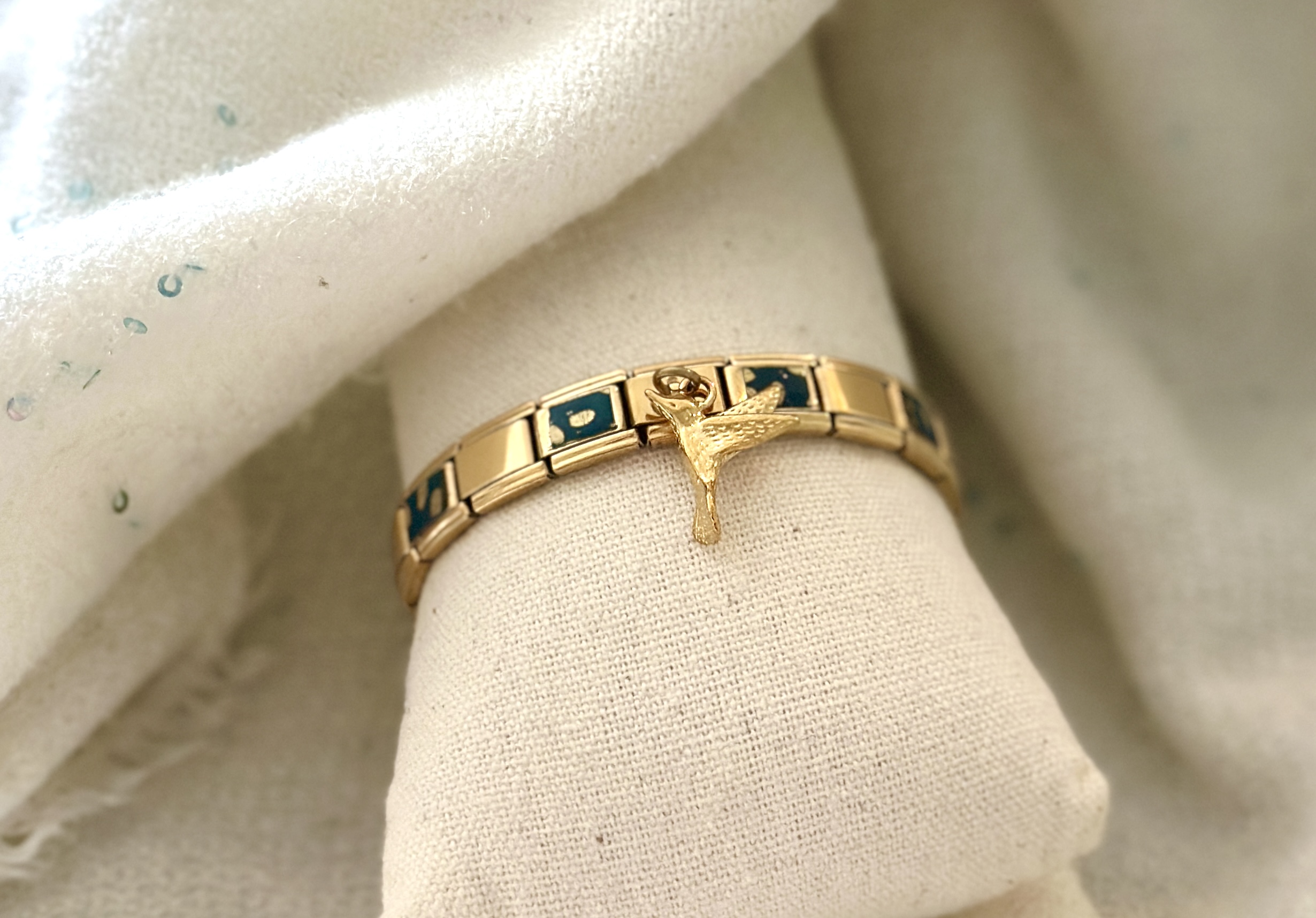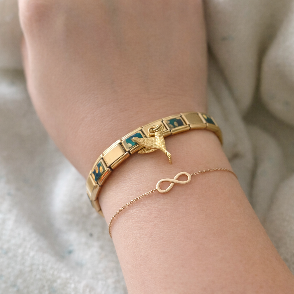 Le bracelet est sublimé par une délicate breloque dorée (colibri) qui ajoute charme et personnalité à l’ensemble.