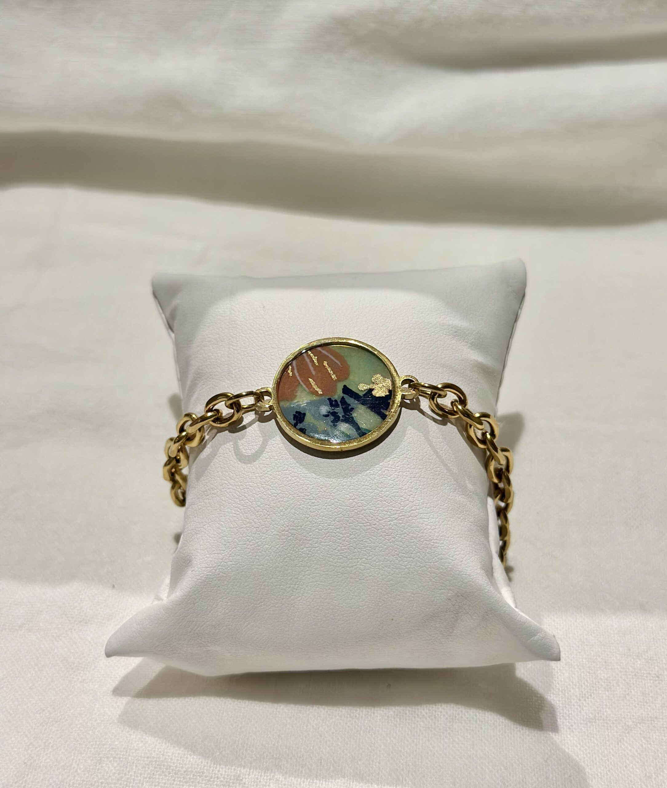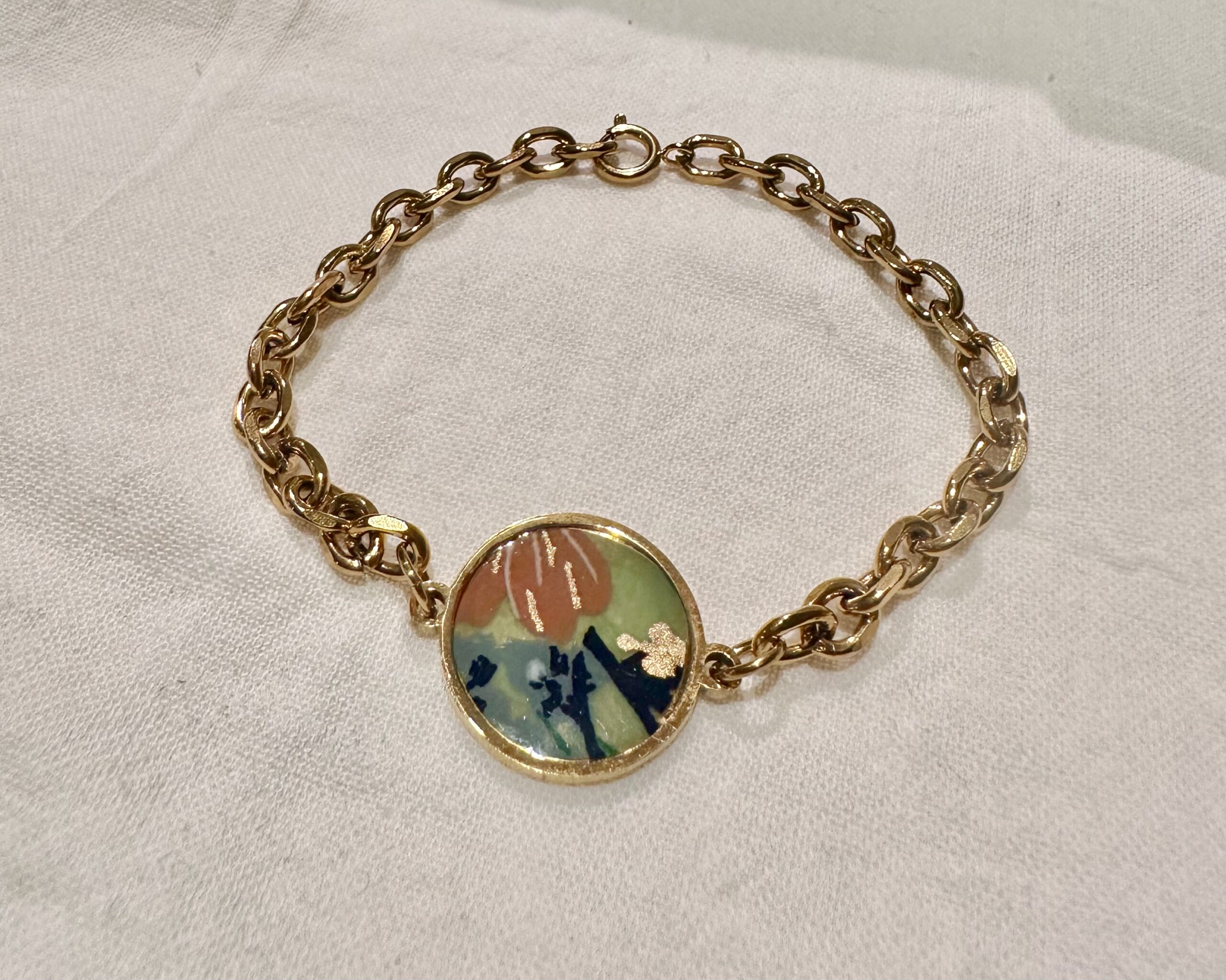 Joli bracelet en acier inoxydable grosse maille agrémenté d’un médaillon plein. Un magnifique papier de coton décore ce dernier au motif floral et résiné pour une meilleure protection. Ce bracelet se portera en toute occasion, il est chic élégant avec une pointe d’originalité.