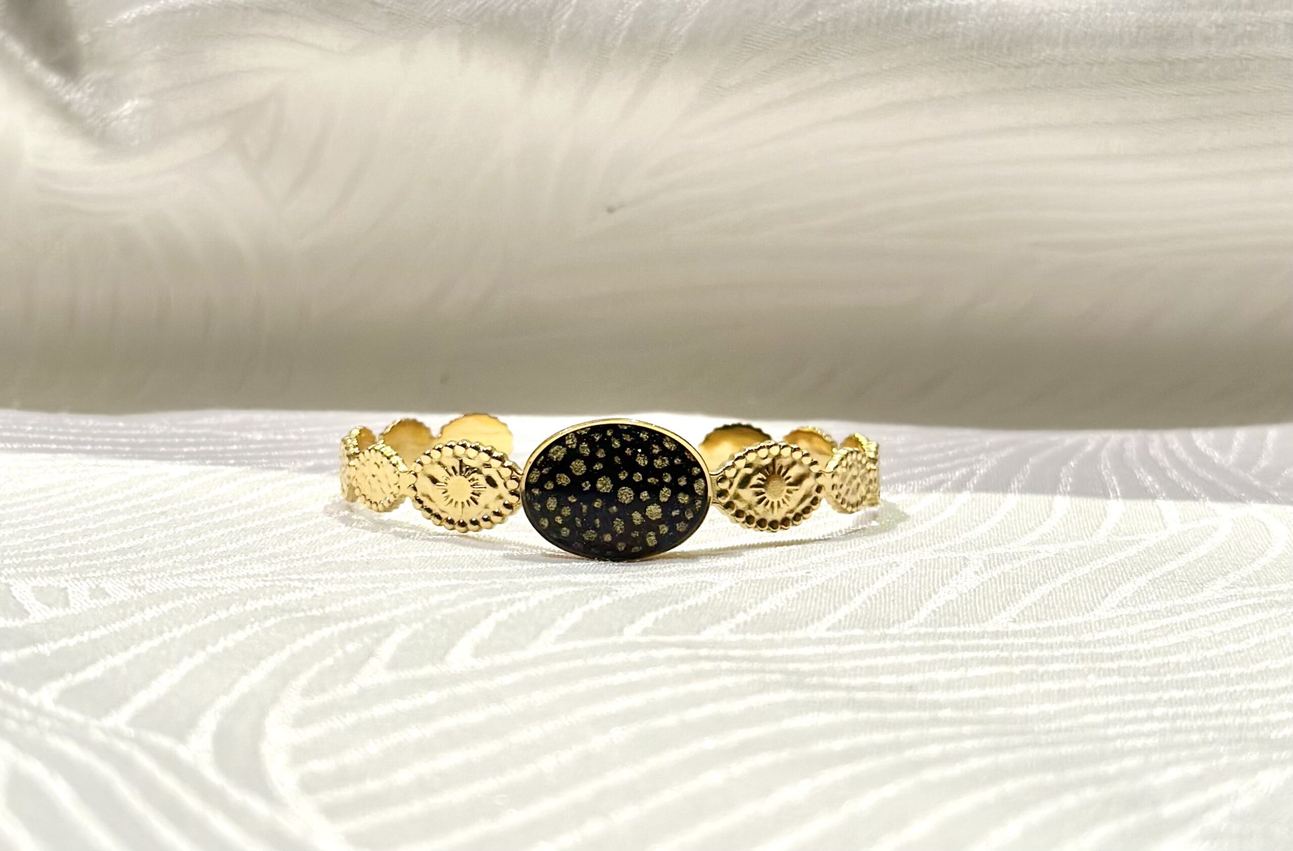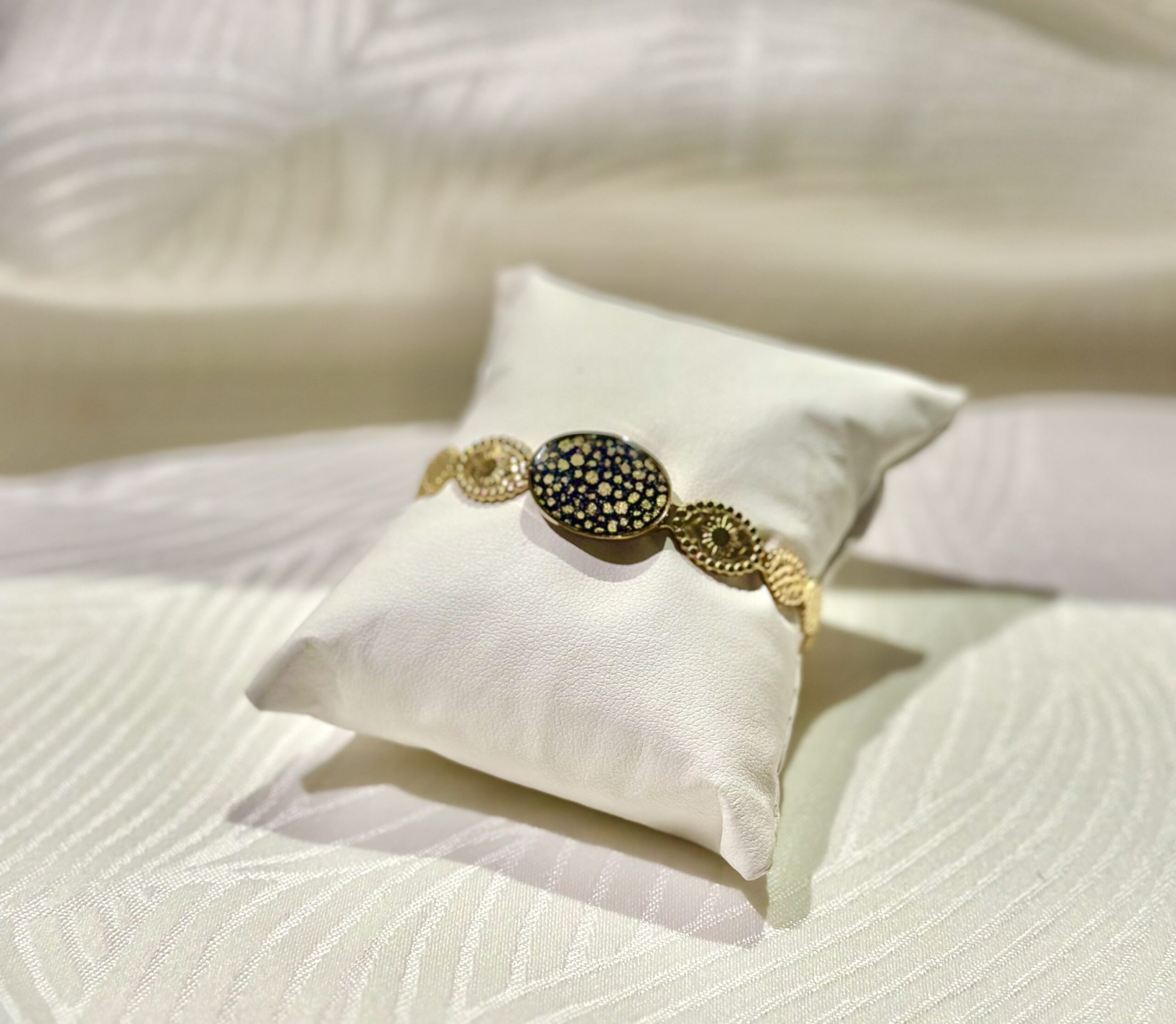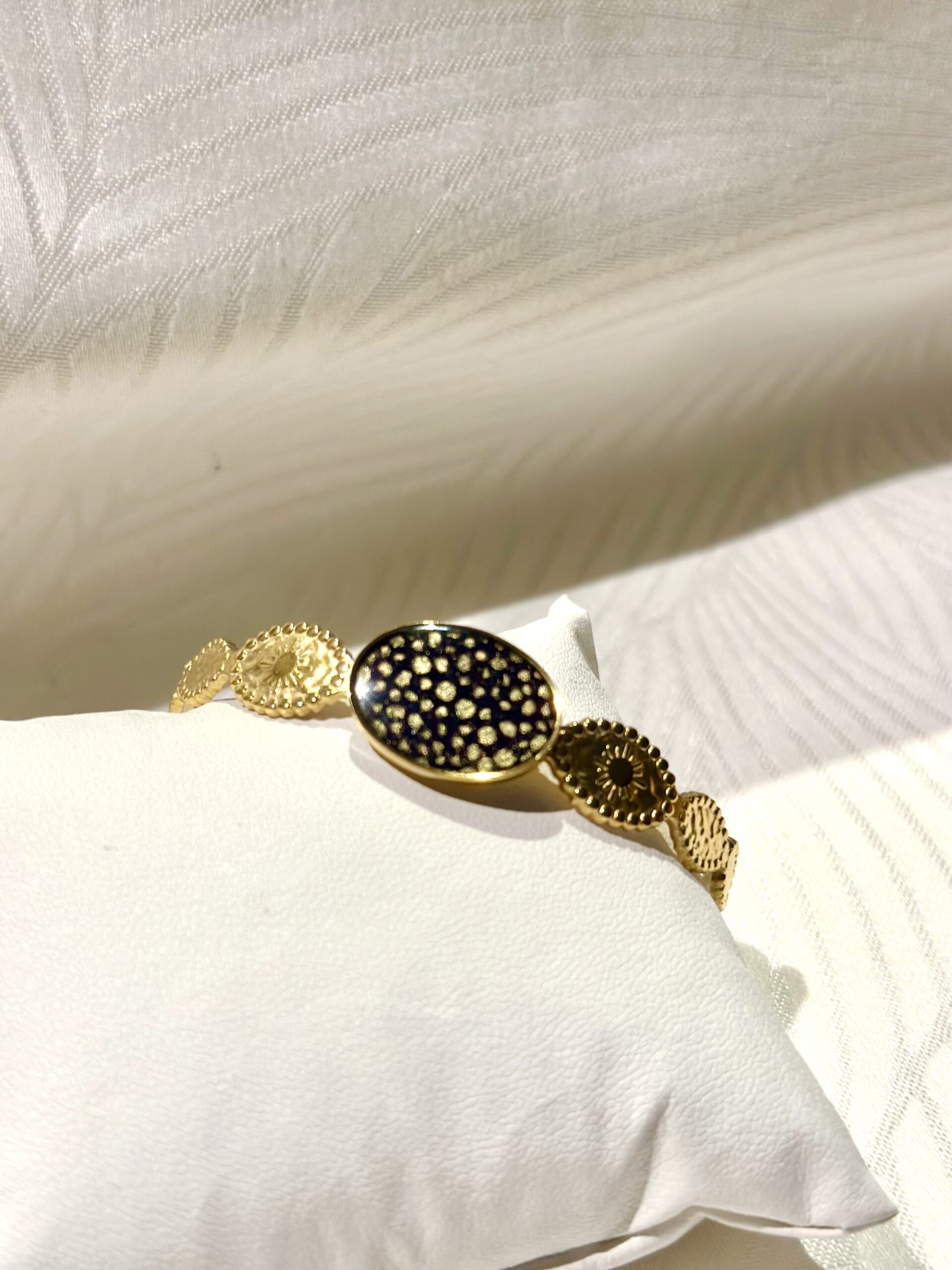 Bracelet jonc ajustable ouvert en acier doré à l’or 24 k décoré d’un papier népalais bleu profond à pois doré, résiné.