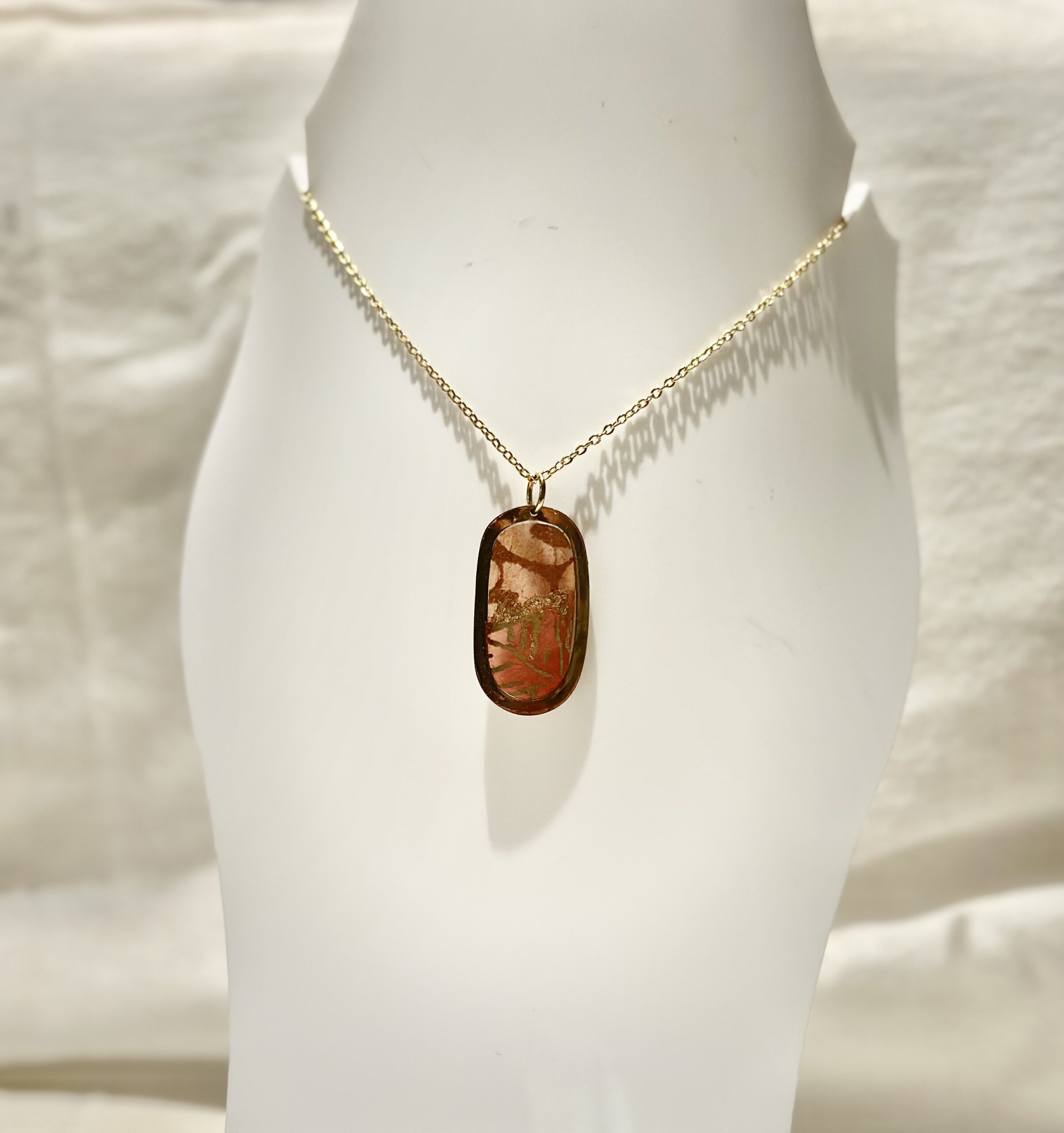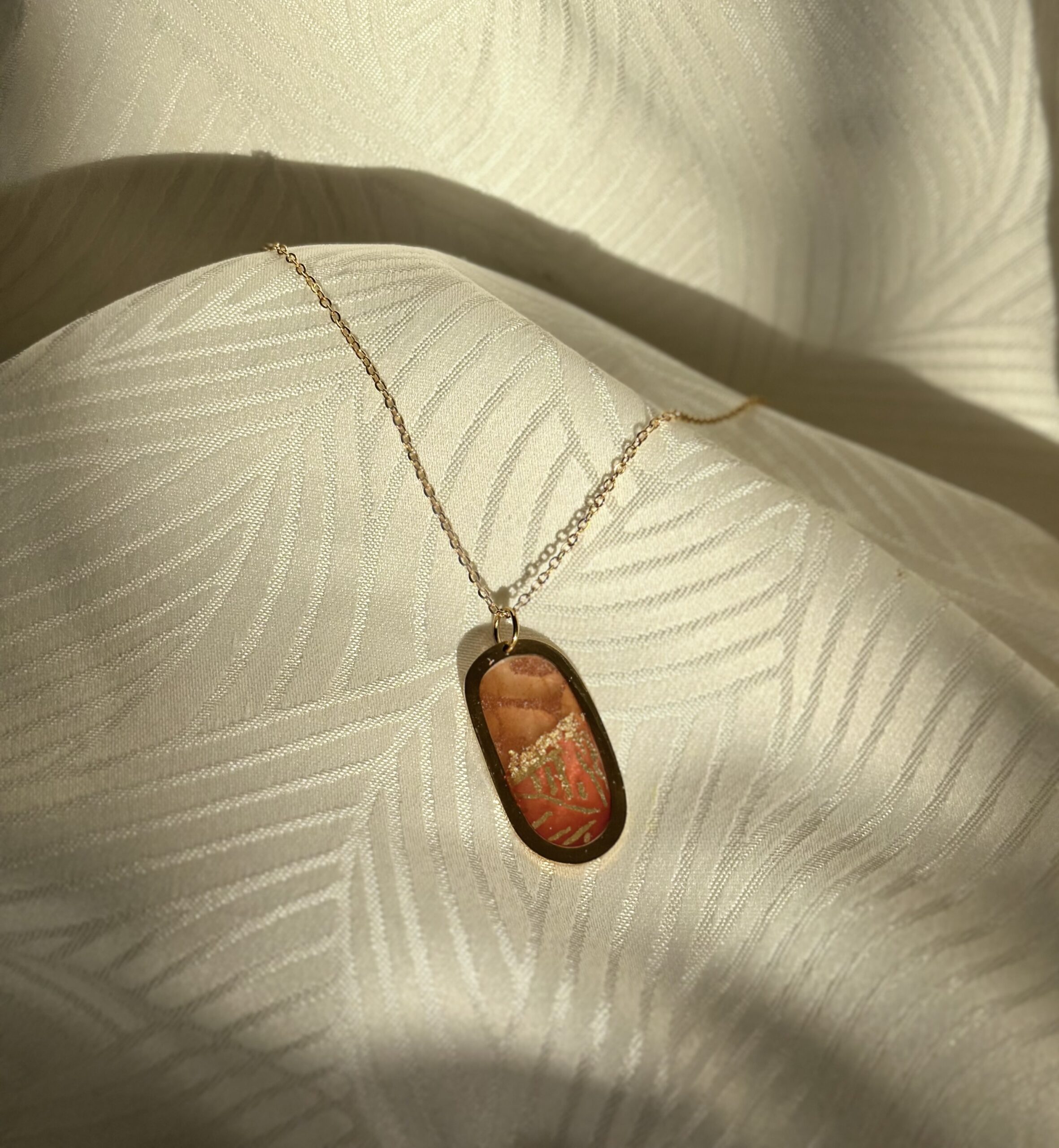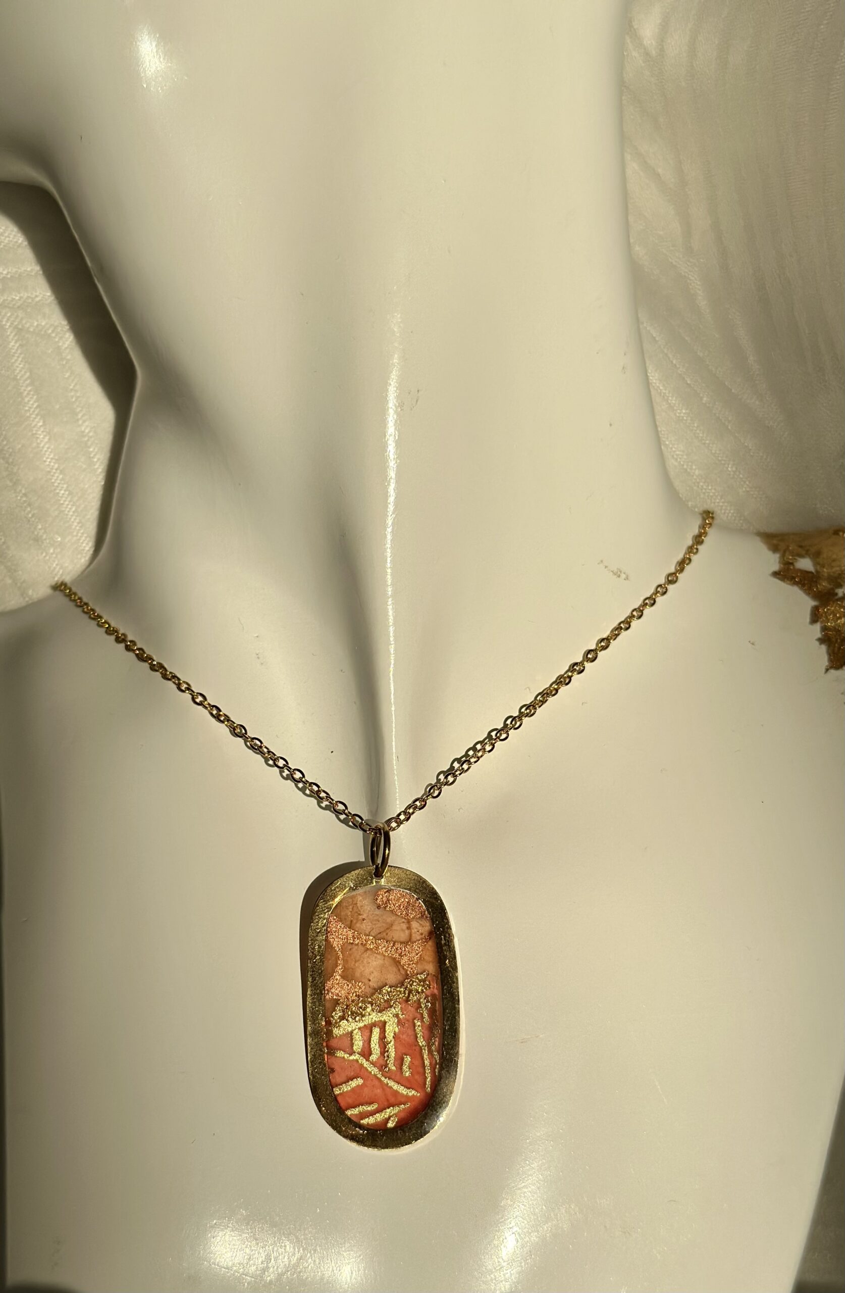 Ce collier est en acier inoxydable doré agrémenté d’un  médaillon oval ajouré  décoré d’une superposition de papier népalais accompagnés de feuille d’or créant un effet coloré chic et élégant. La Chaîne maille forçat en acier inoxydable doré mesure environ 40 cm. Le papier est résiné pour une meilleure protection.