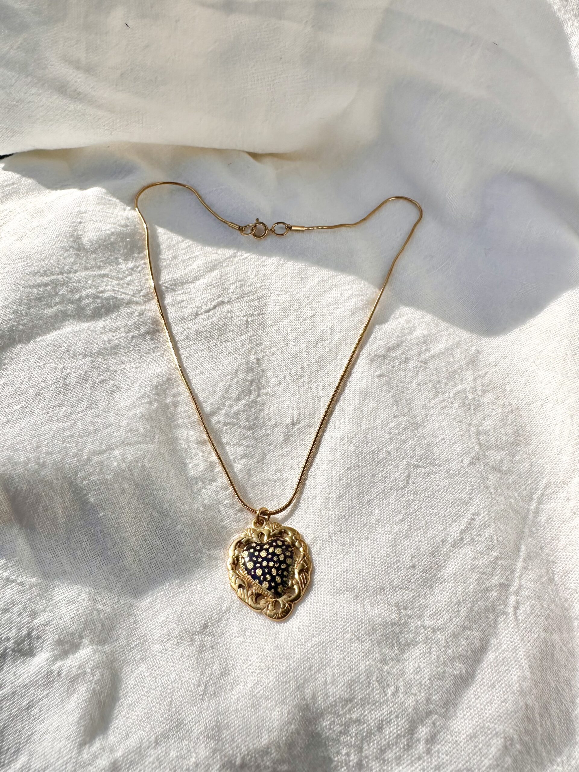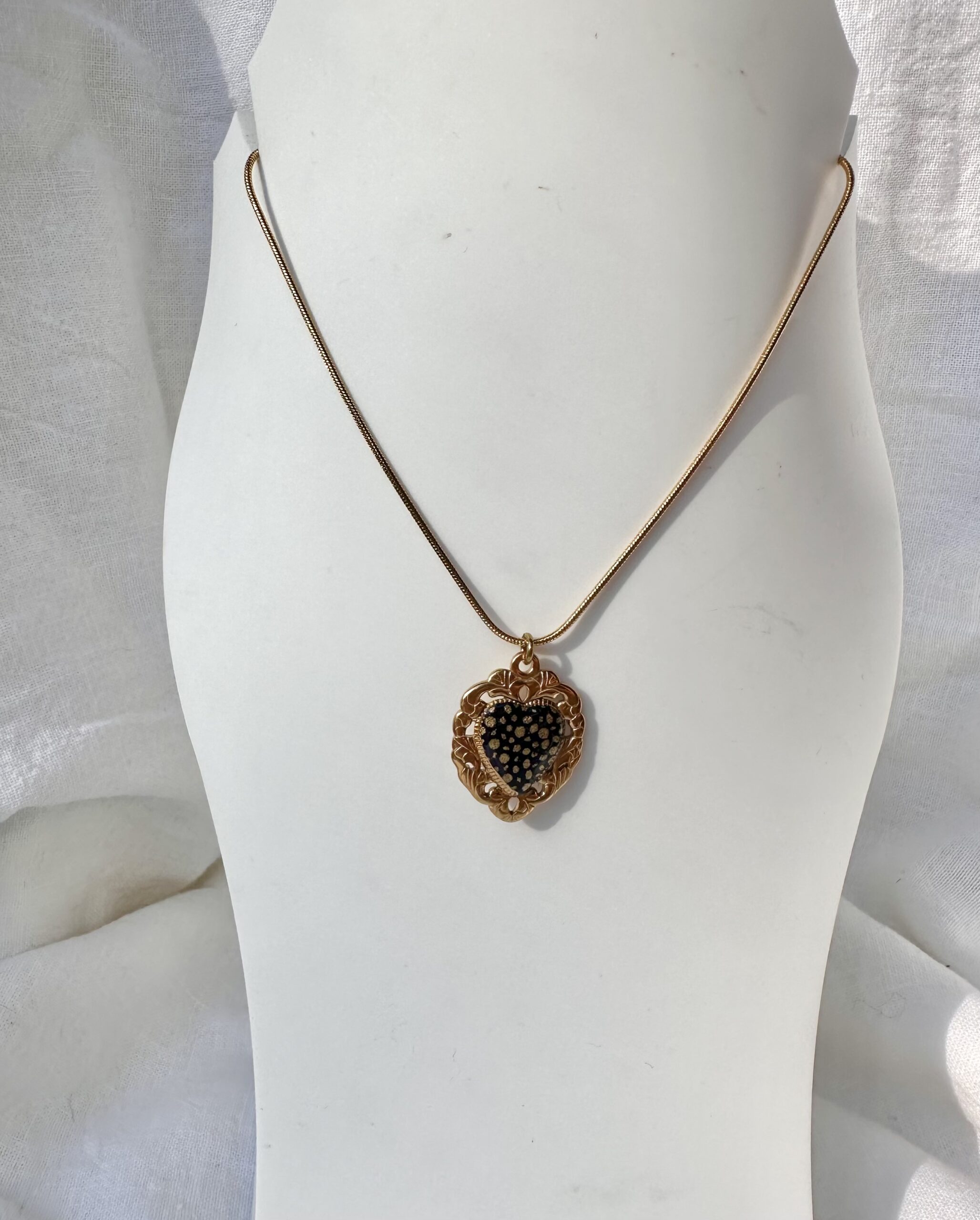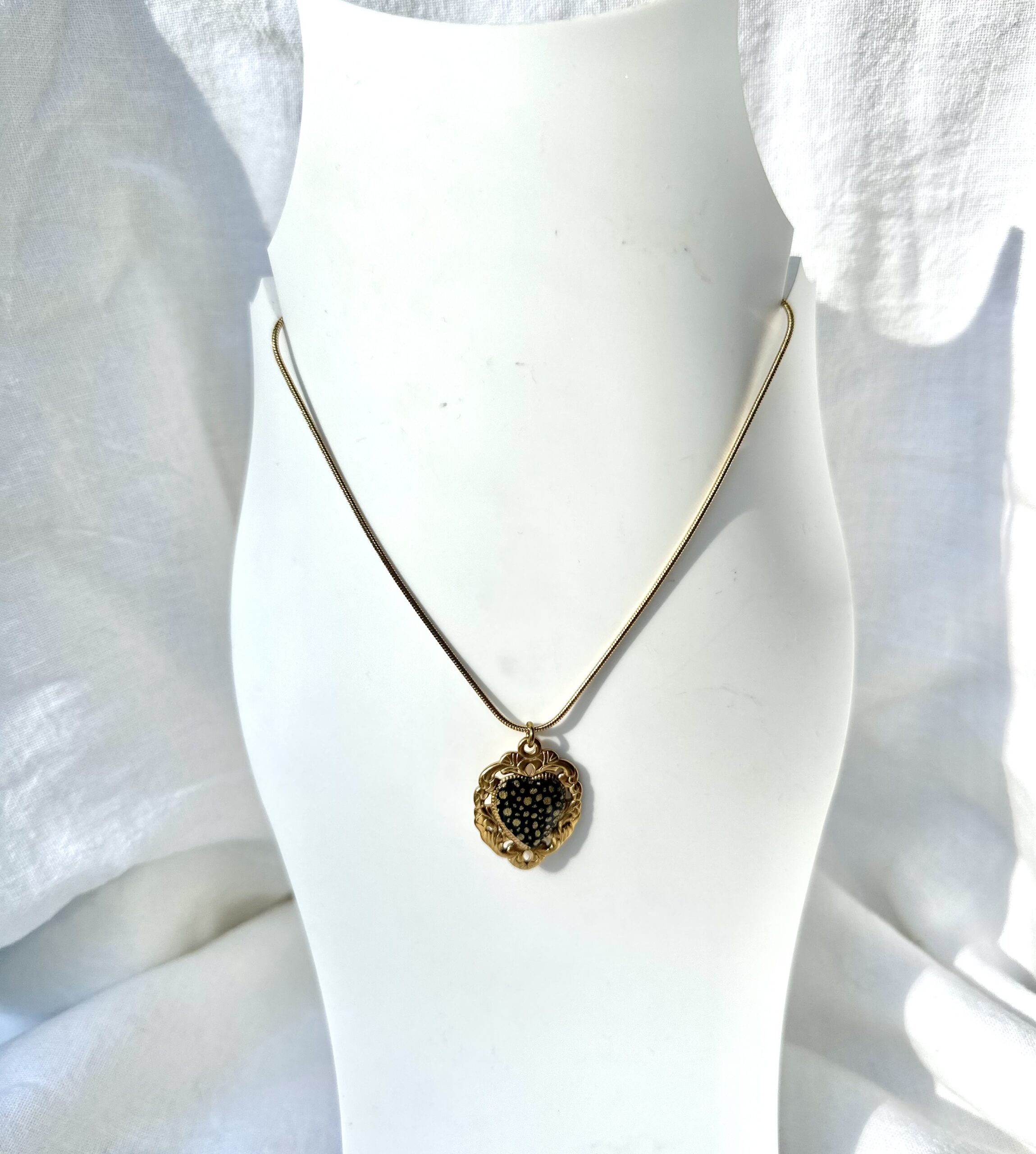 Apportez une touche d’originalité et d’élégance à votre tenue avec ce collier unique composé d’une chaîne en inox doré (maille serpentine) et d’un pendentif en forme de coeur baroque. Le coeur est recouvert de papier Népalais artisanal, aux motifs colorés et délicats, dans les tons bleu foncé et doré protégé par une couche de résine pour assurer sa durabilité.