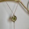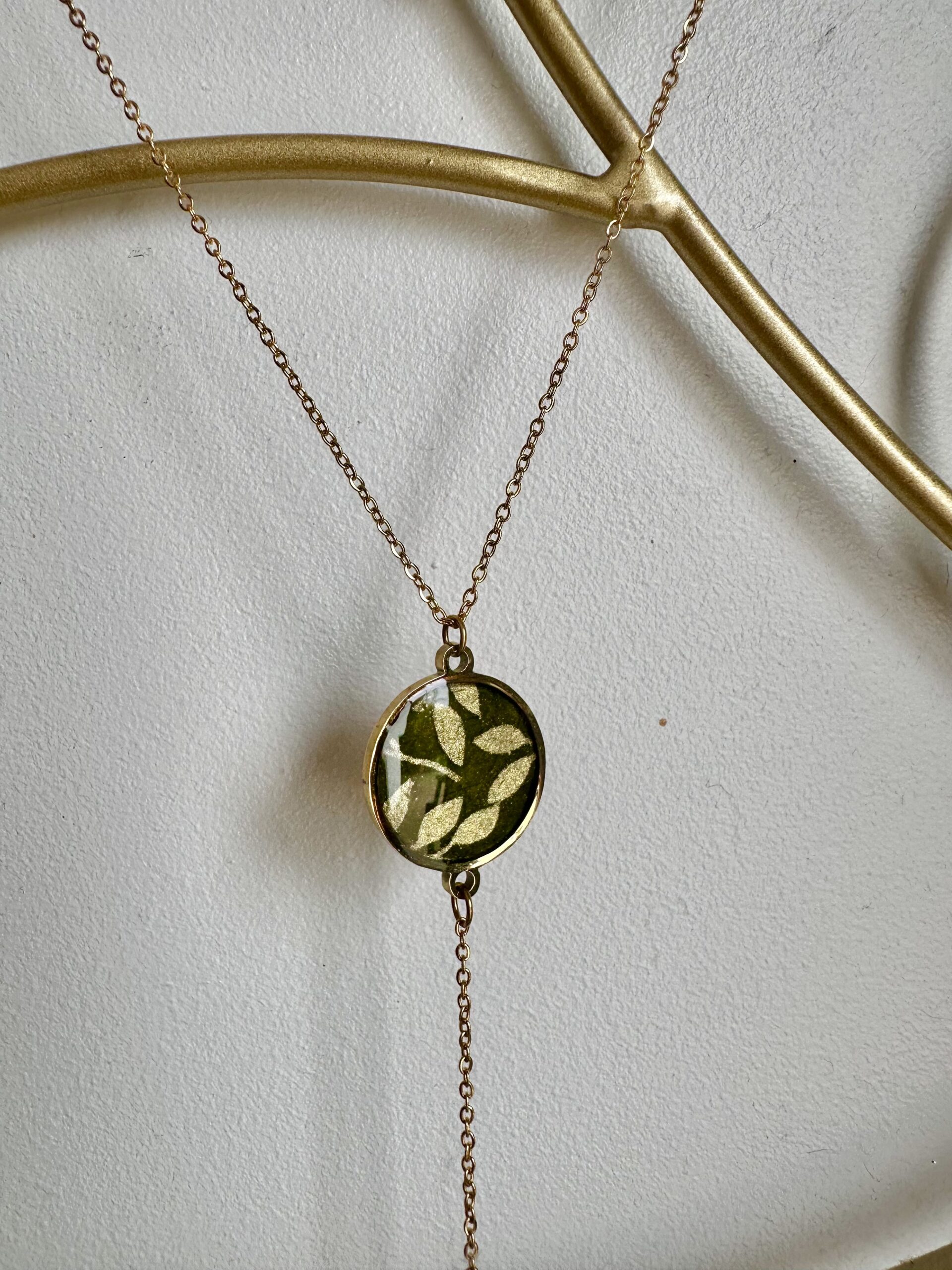 La partie supérieure est un médaillon en acier rond doré décoré en papier Népalais floral de couleur vert et doré puis résiné pour le protéger.