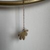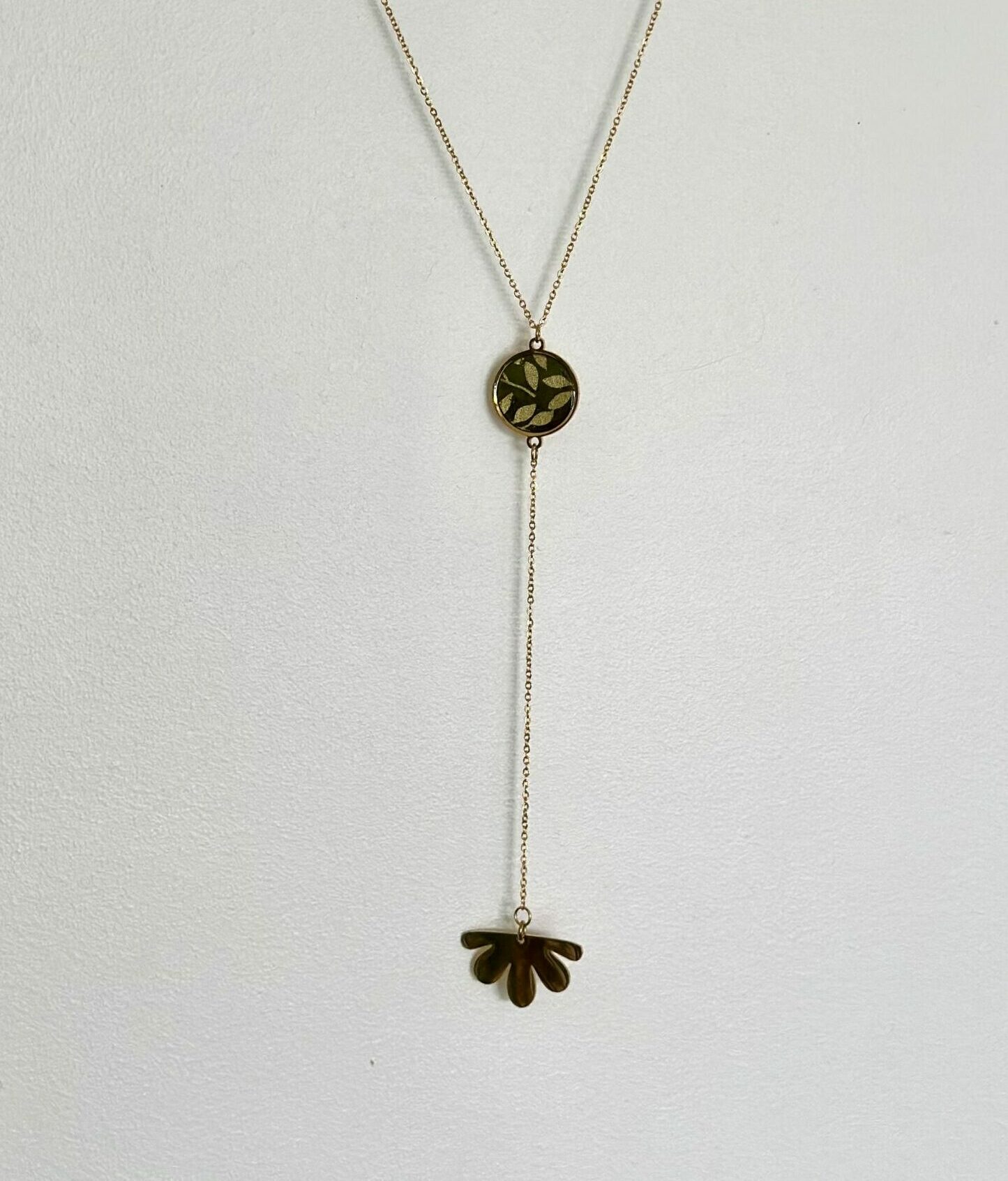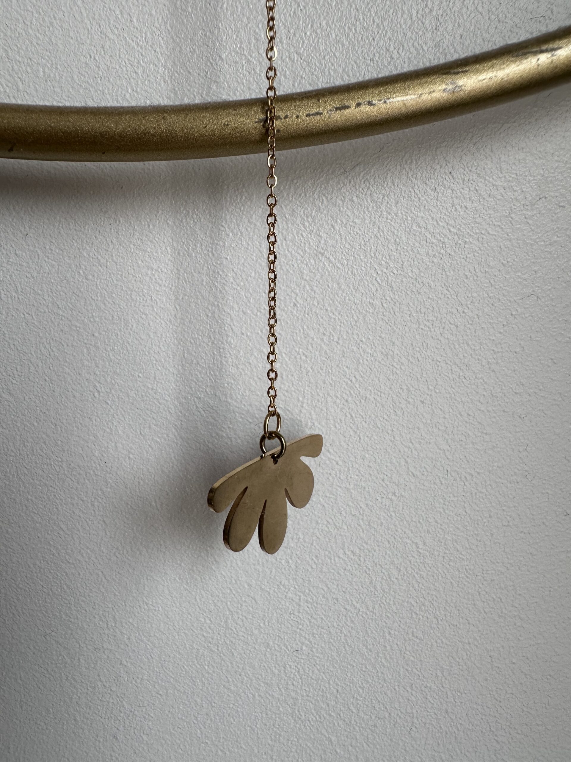 La partie inférieure, suspendue par une chaînette fine, se termine par une forme abstraite dorée rappelant une feuille tombante.